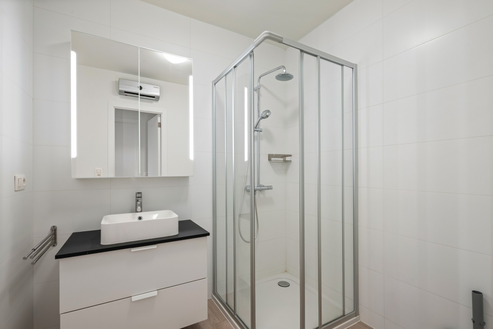 Het appartement is gelegen op de benedenverdieping en kenmerkt de inkomhal met ingebouwde vestiairekasten, het apart toilet, de badkamer met enkel wastafel in meubel en douche (ook aansluiting voor wasmachine en droogkast), de ruime slaapkamer, de lichtrijke woonkamer met open keuken (inductiekookplaat, dampkap, enkele spoelbak, vaatwasser, combi-oven, koelkast & diepvriezer).