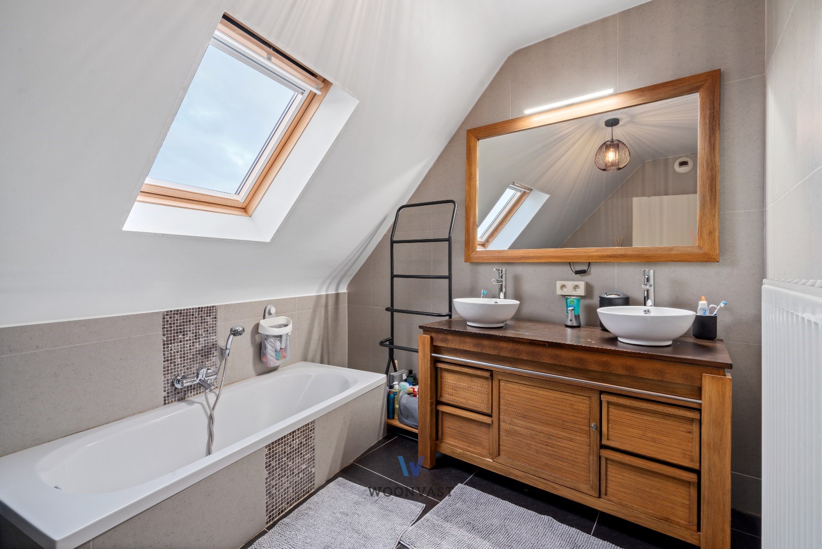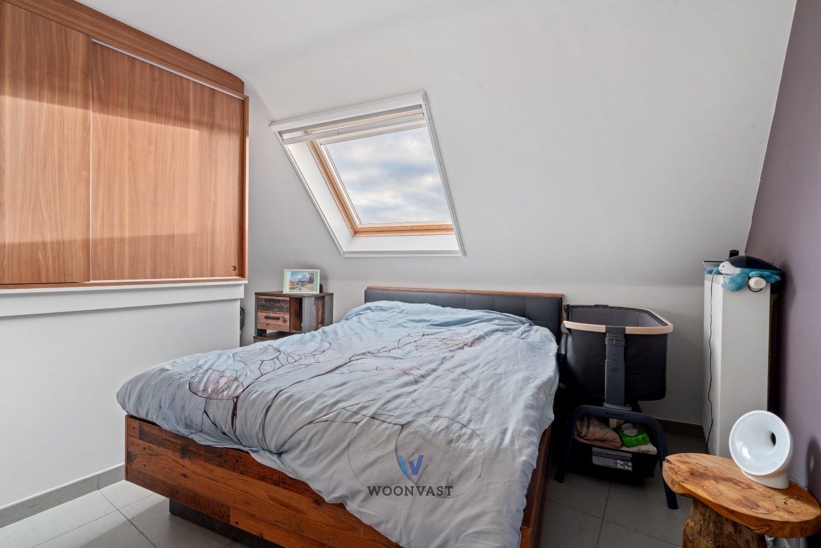 Op de eerste verdieping wacht een ruime slaapkamer met ingemaakte kasten, waardoor opbergruimte geen probleem is.