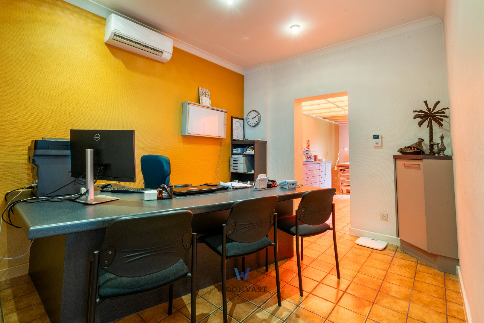 Op het gelijkvloers bevindt zich een ingerichte wachtzaal en praktijkruimte – ideaal voor zelfstandigen of wie wonen en werken wil combineren. Verder vind je er een lichtrijke leefruimte met aparte keuken, gastentoilet en veel sfeer.