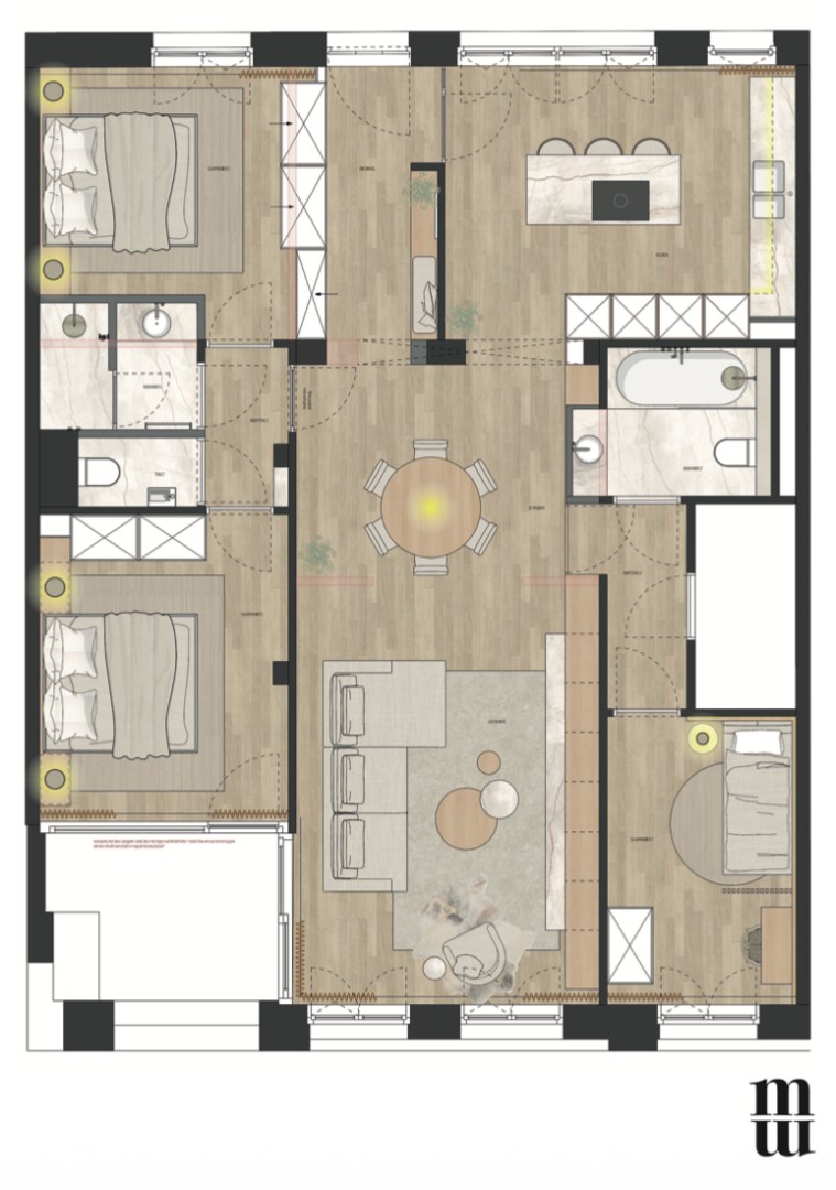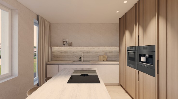 Via de lift bereikt u het appartement op het 4de verdiep, waar u via het eerste terras toegang krijgt tot de inkomhal, de lichtrijke leefruimte met open keuken. De penthouse beschikt over drie slaapkamers, twee badkamers en een berging, perfect ingedeeld voor optimaal wooncomfort. Grote raampartijen zorgen voor overvloedig daglicht en een open gevoel met zicht op de omgeving.
