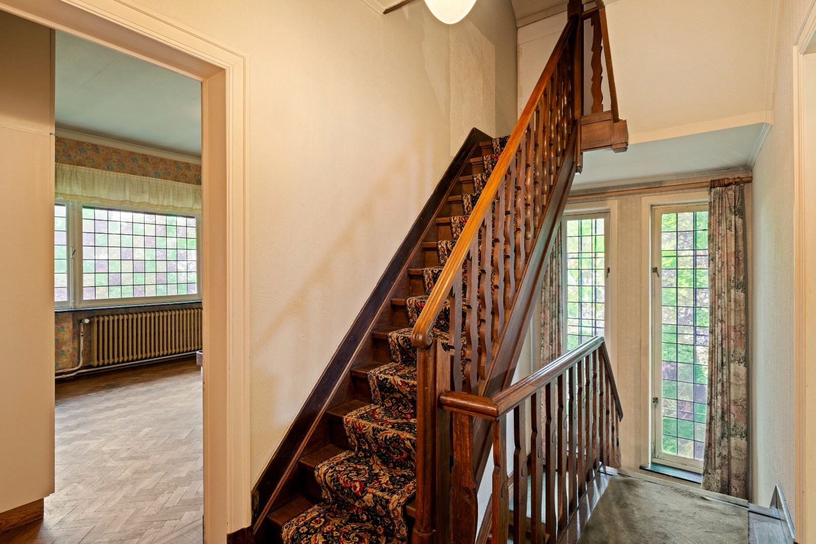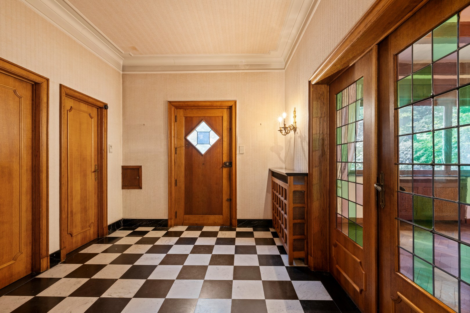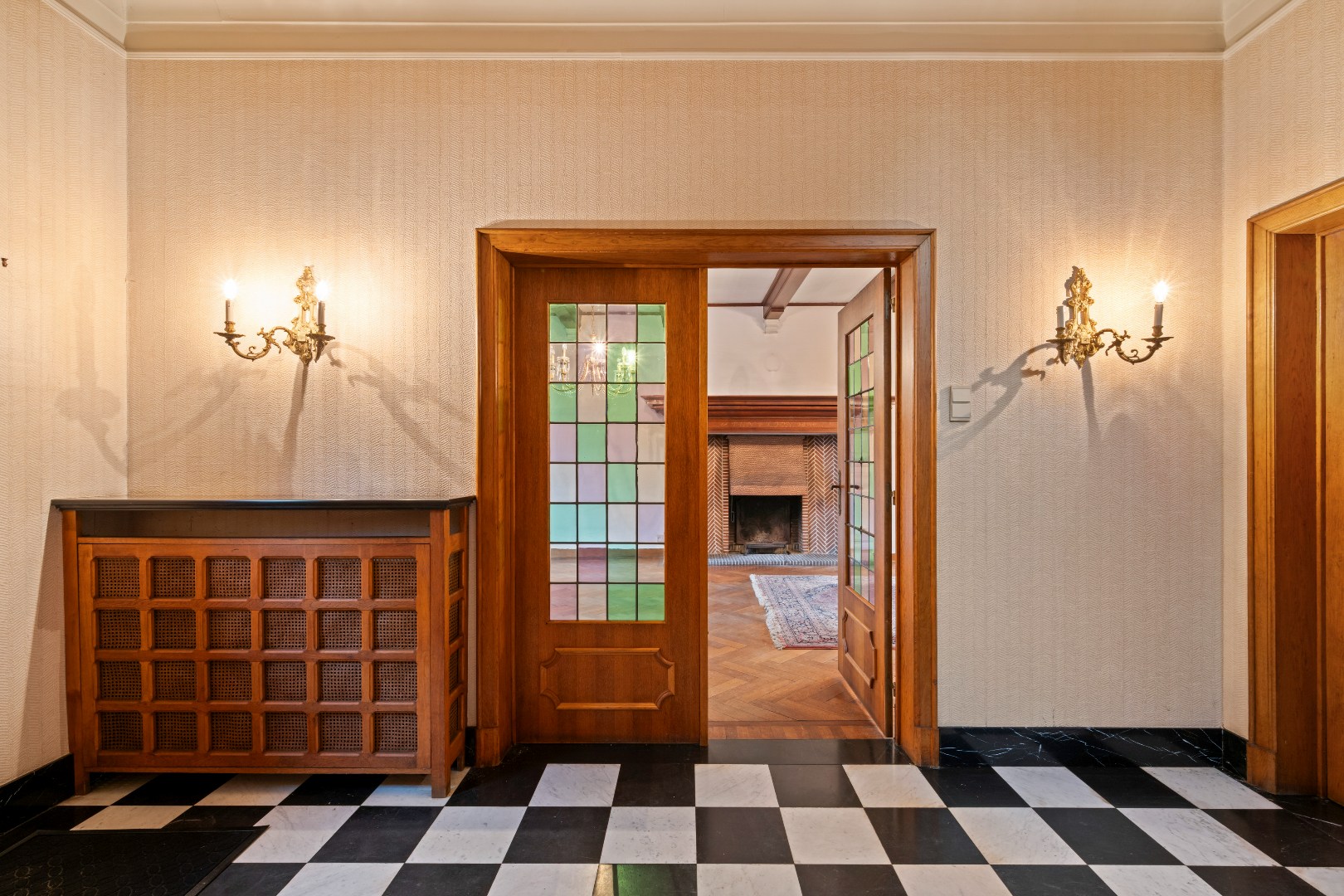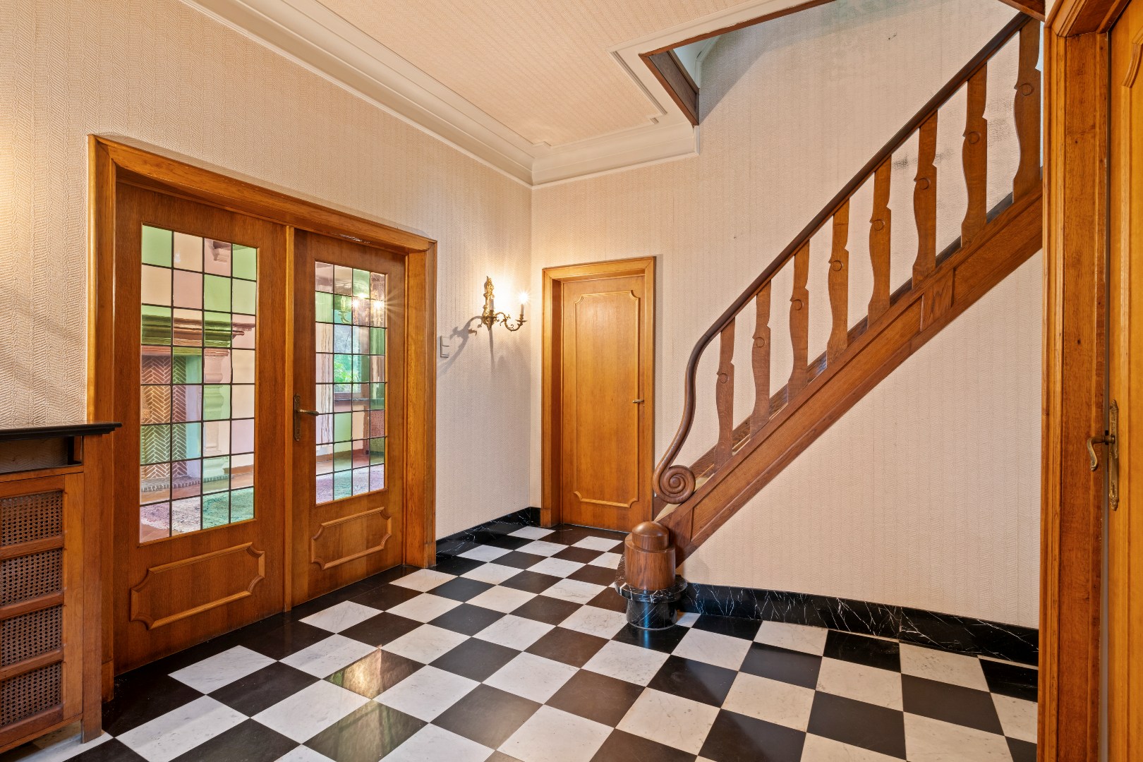 De inkomhal met zwart-wit dambordvloer, de statige trap, de glas-in-looddeuren en het warme houtwerk geven deze woning een ziel die je vandaag zelden nog vindt.