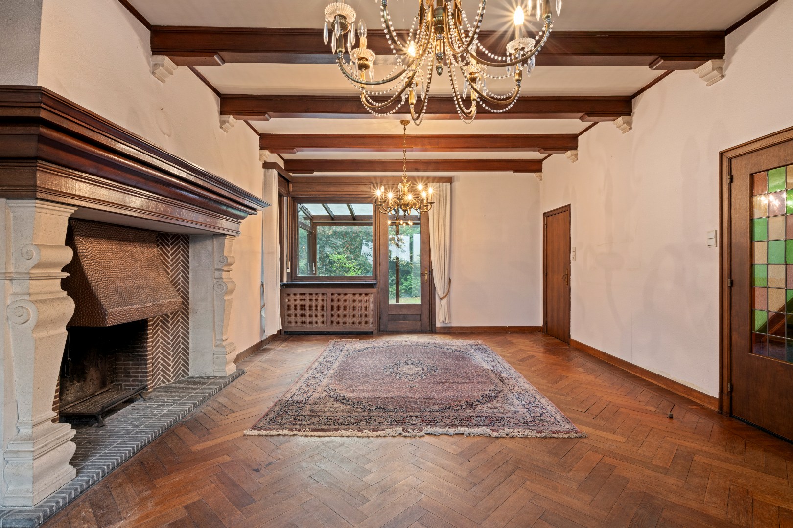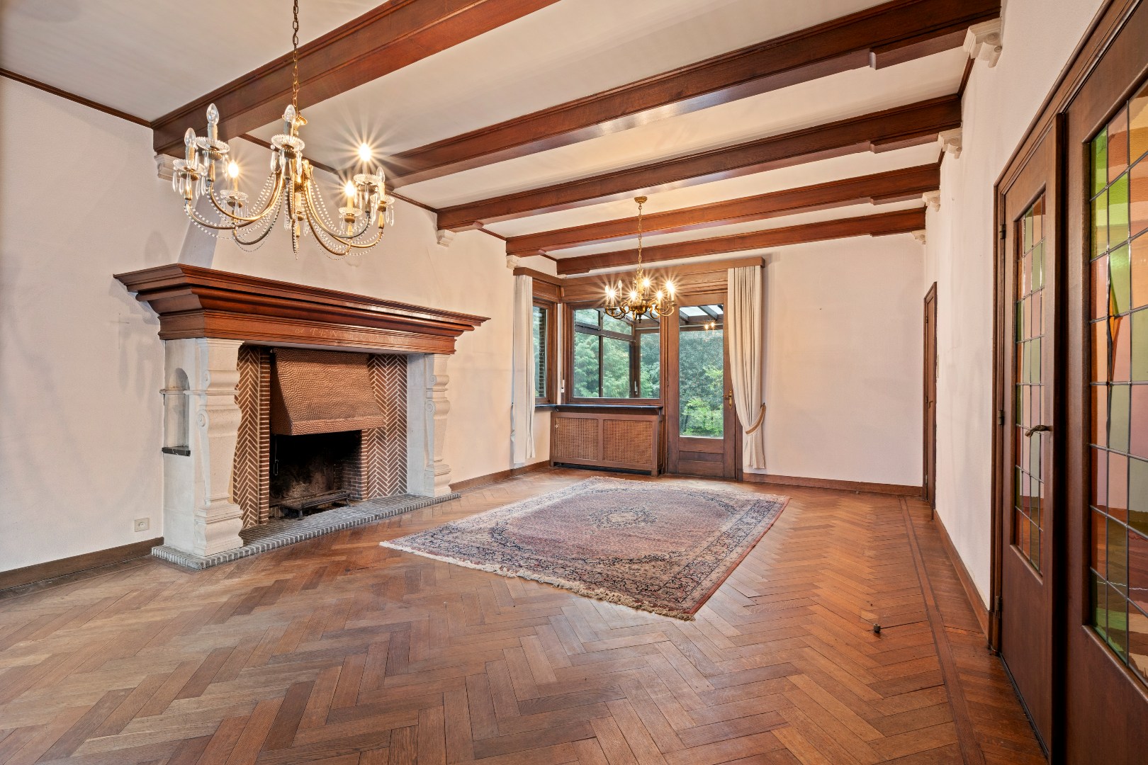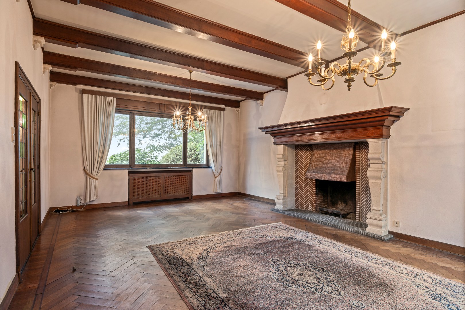 De leefruimte ademt grandeur: hoge plafonds met balken, een indrukwekkende schouw en grote ramen die uitkijken op de tuin.