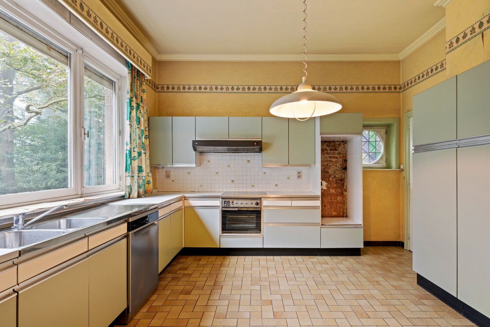 De keuken, ruim en licht, vormt een mooie basis voor een moderne herinrichting met zicht op het groen.