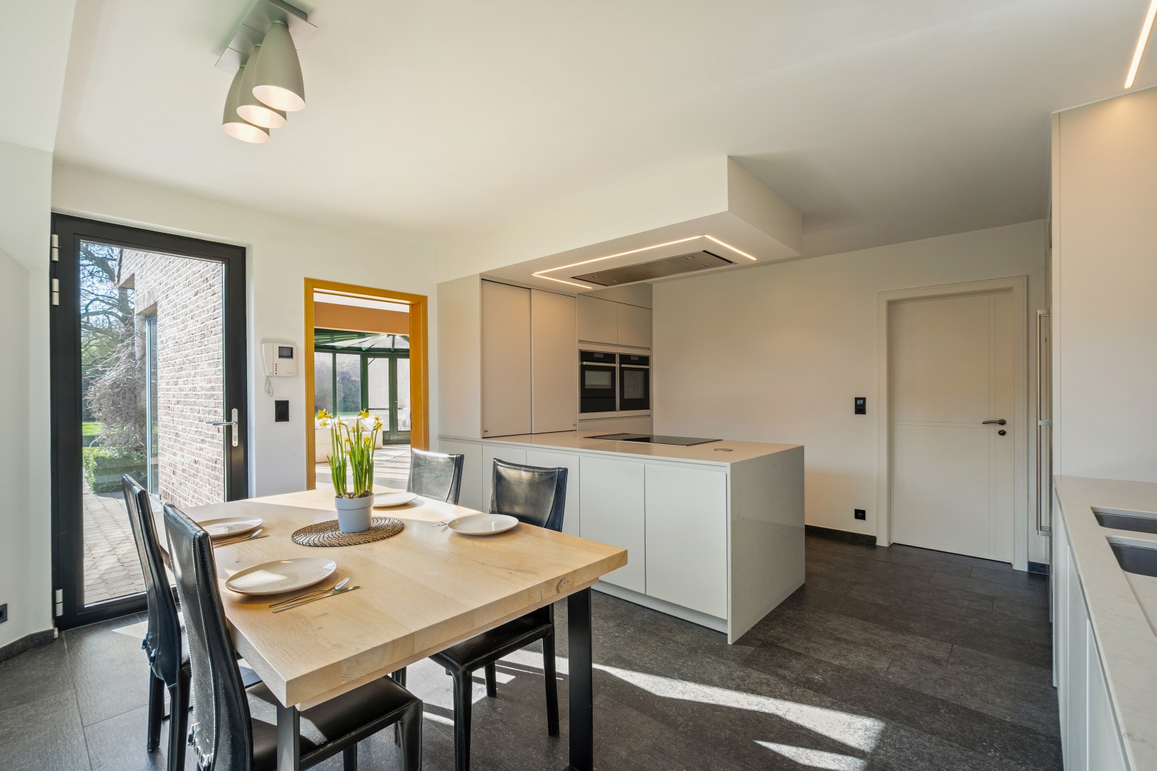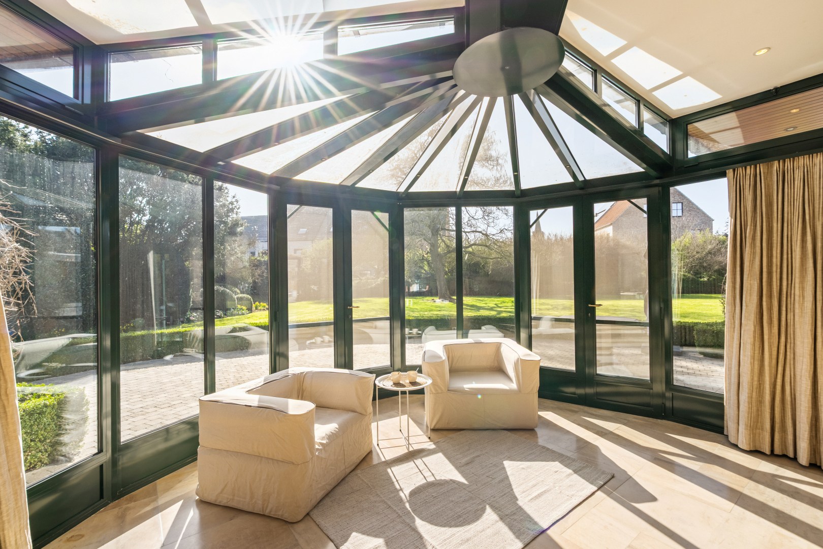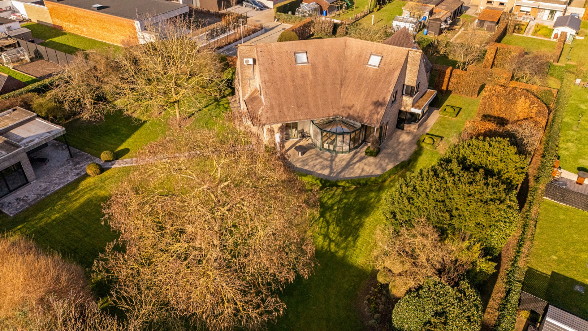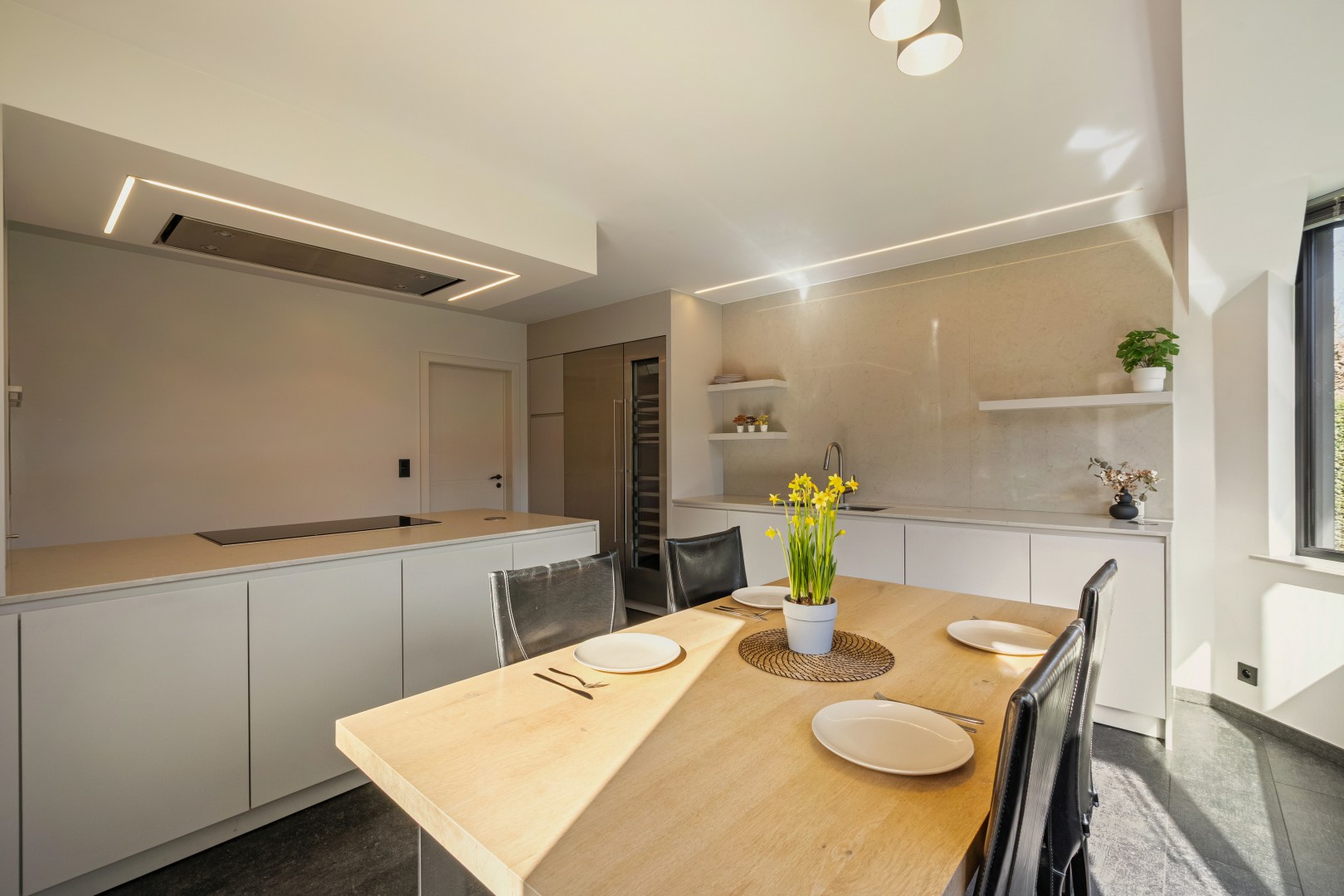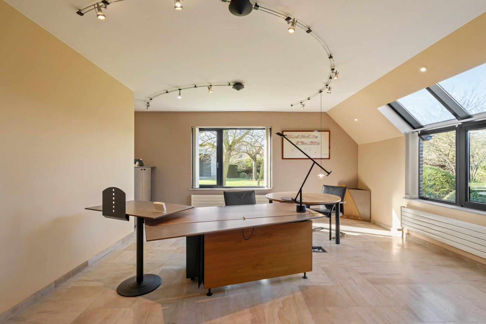 De villa kenmerkt op de benedenverdieping de inkomhal met vestiaireruimte, een eerste apart toilet, de bureau, de extreem lichtrijke woonkamer met eetplaats, de volledige vernieuwde keuken (dubbele spoelbak, dampkap, wijnfrigo, inductiekookplaat, stoomoven, combi-oven, vaatwasser en koelkast), de bergruimte, de dubbele garage met vernieuwde garagepoorten, een tweede toilet en een eerste badkamer met douche en enkele wastafel in meubel.