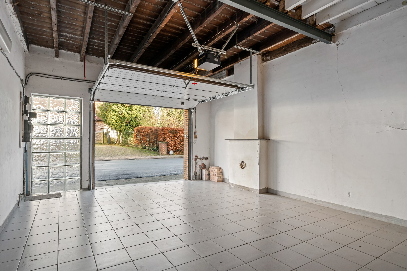 Daarnaast is er een zeer grote garage met automatische poort, perfect voor zelfstandigen, hobbyisten of wie nood heeft aan opslagruimte.