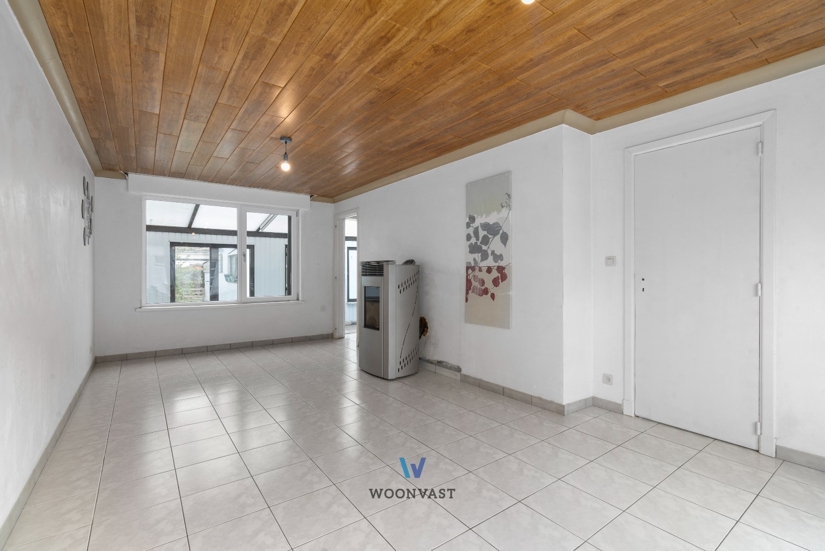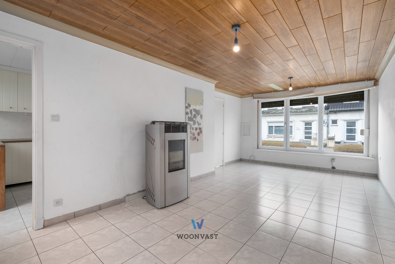 Via de inkomhal met gastentoilet kom je in de keuken en de gezellige woonkamer, waar een pelletkachel zorgt voor een aangename warmte doorheen de hele woning. De lichtrijke veranda biedt een mooie overgang naar het terras en de tuin, waar je in alle rust kan genieten. Achteraan bevindt zich de garage, die bereikbaar is via een privéweg achter de woning.