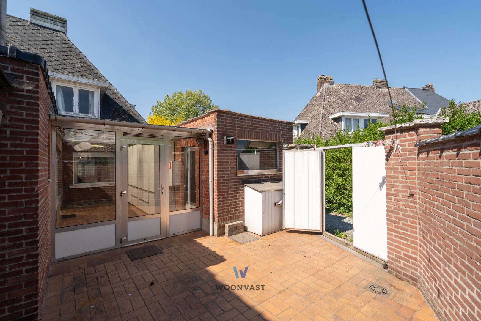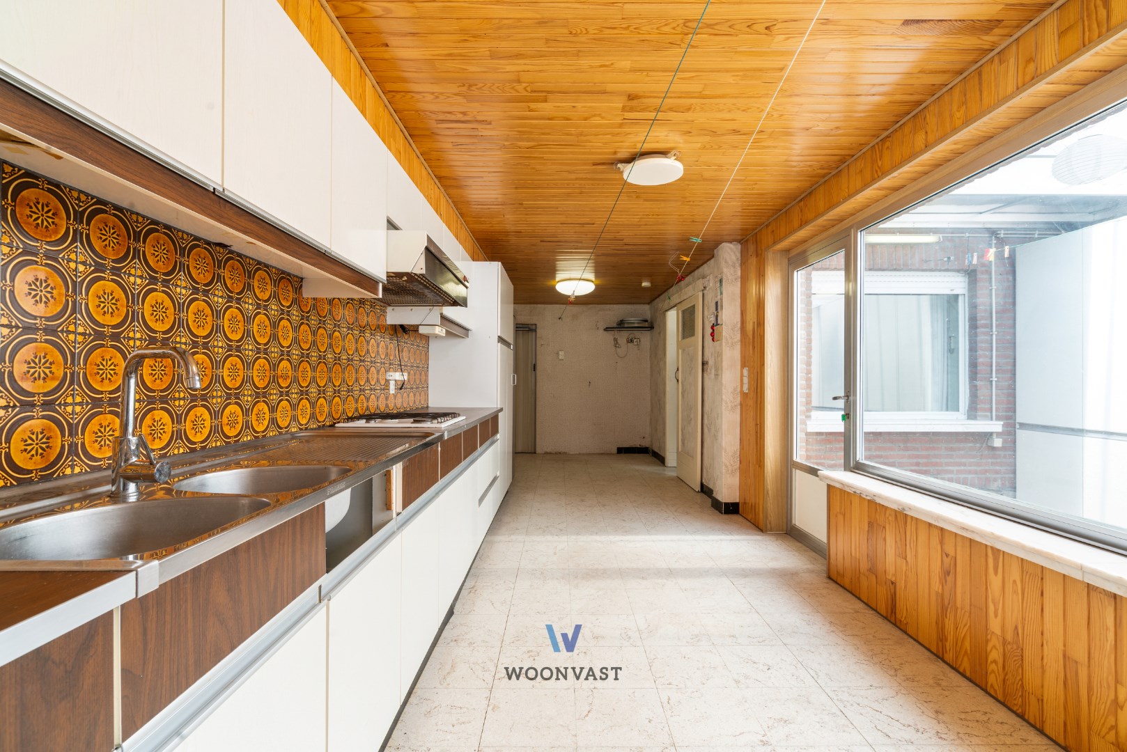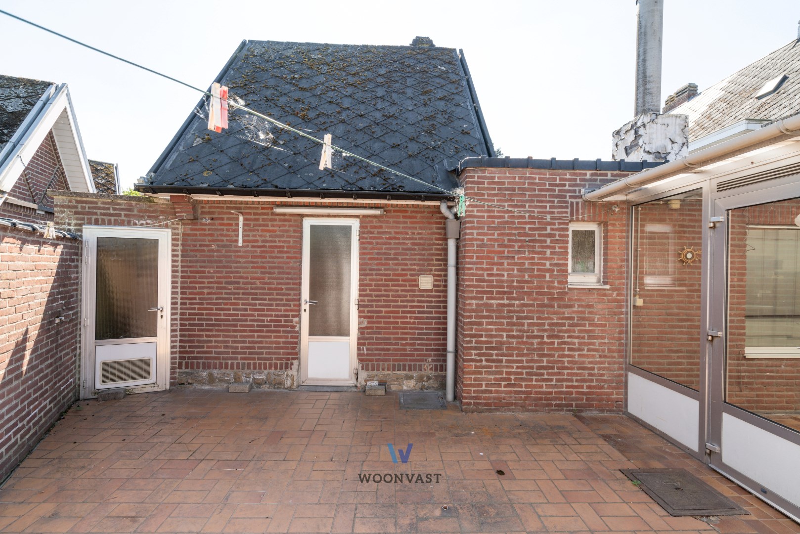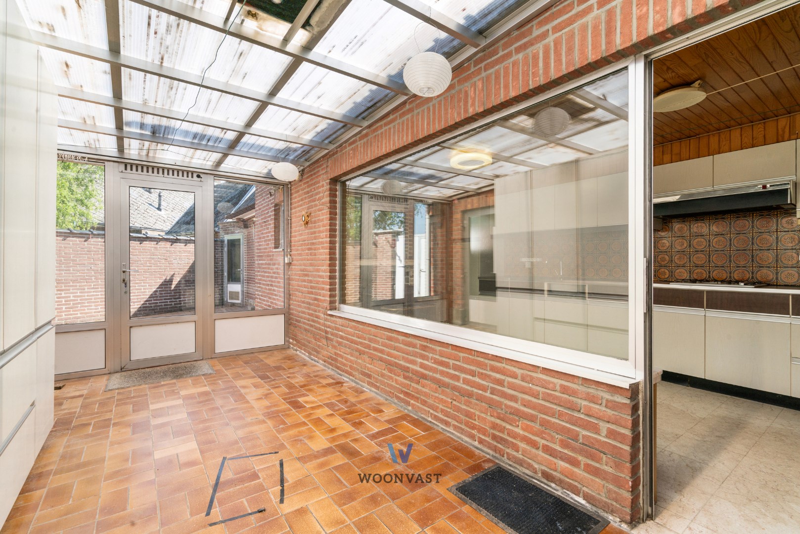 Bij het betreden van de woning komen we binnen in de inkomhal die toegang biedt tot de leefruimte. Via deze ruimte komen we terecht in de zeer ruime keuken waar zich nog een badkamer achter bevindt. Naast de keuken bevindt zich nog een gezellige veranda die toegang geeft tot de koer, die beschikt over een achteruitgang wat ideaal is voor fietsen of het vuilnis.