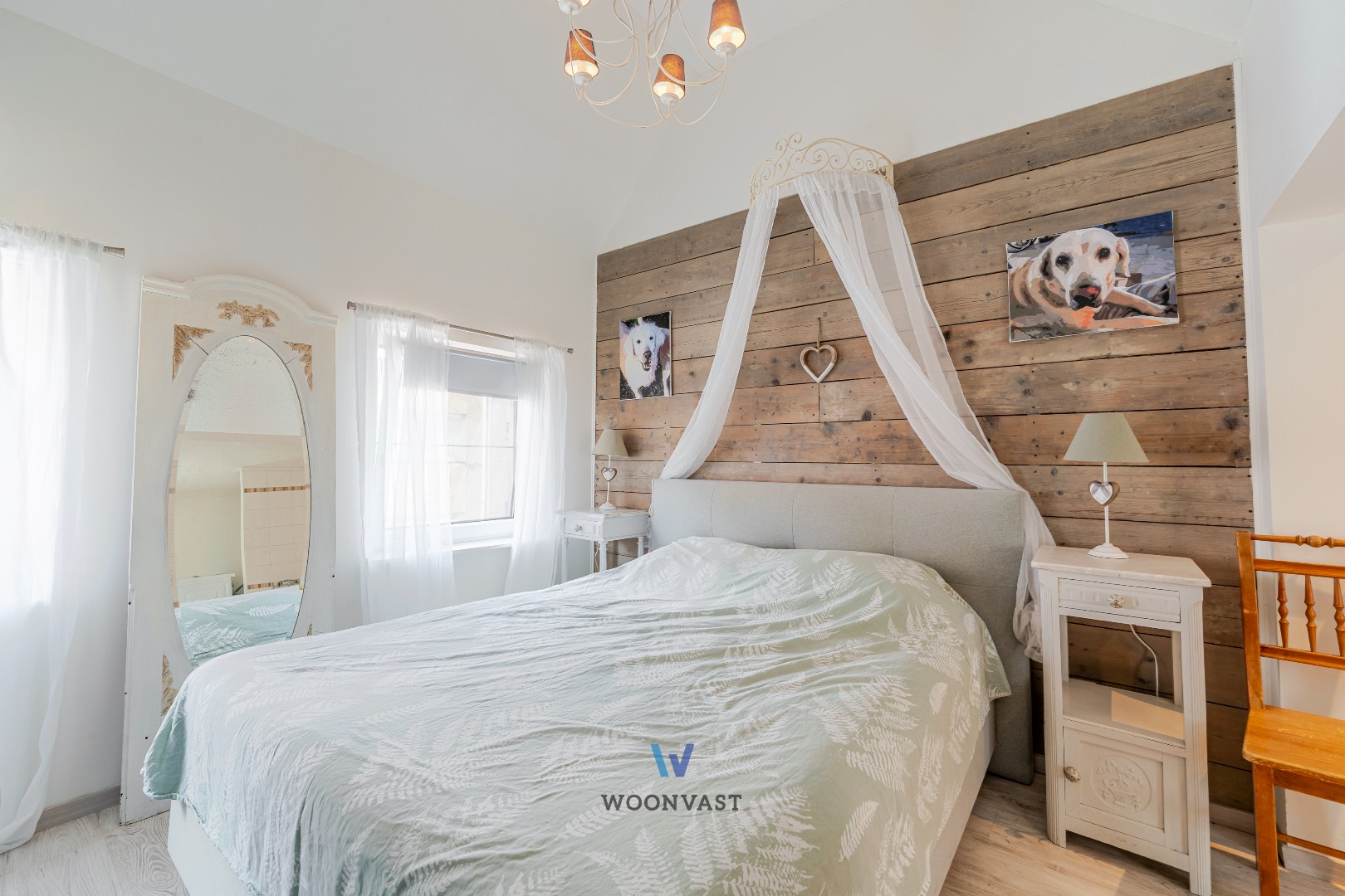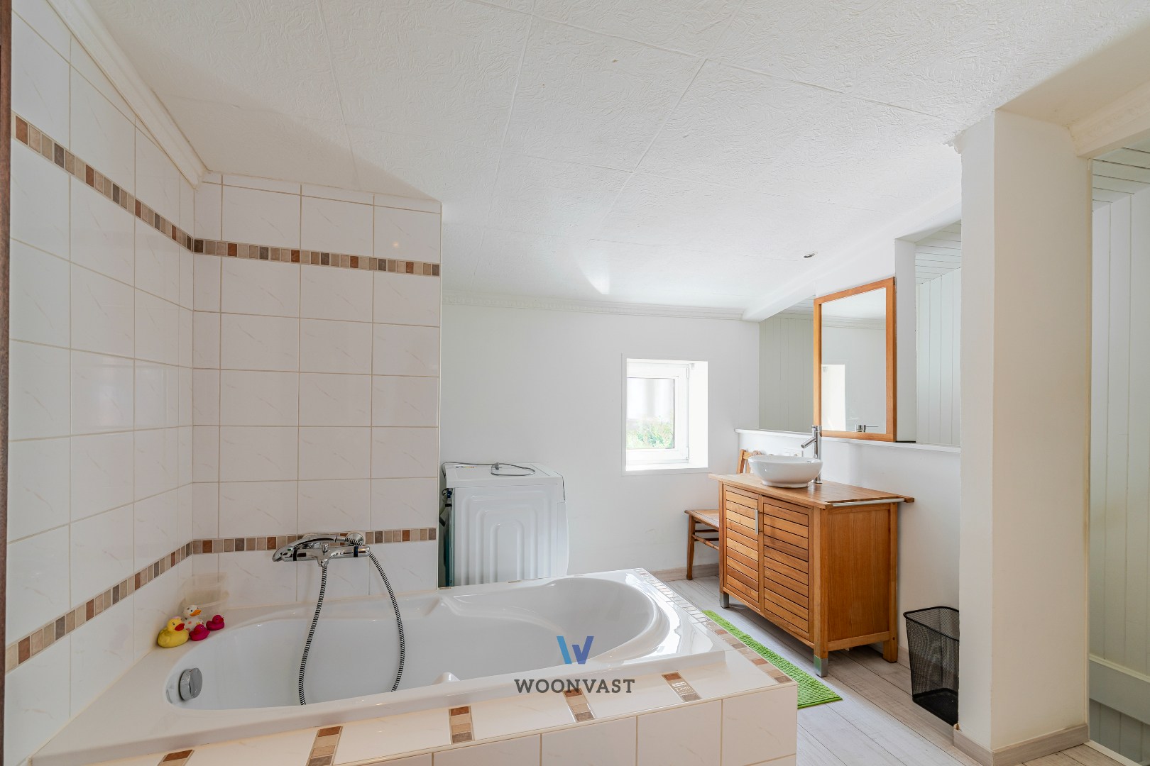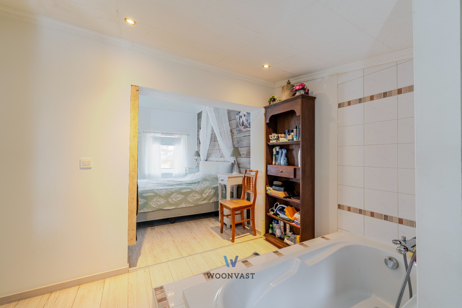 Op de eerste verdieping bevindt zich de badkamer, uitgerust met een comfortabel ligbad. Naast de badkamer treffen we de ruime slaapkamer.