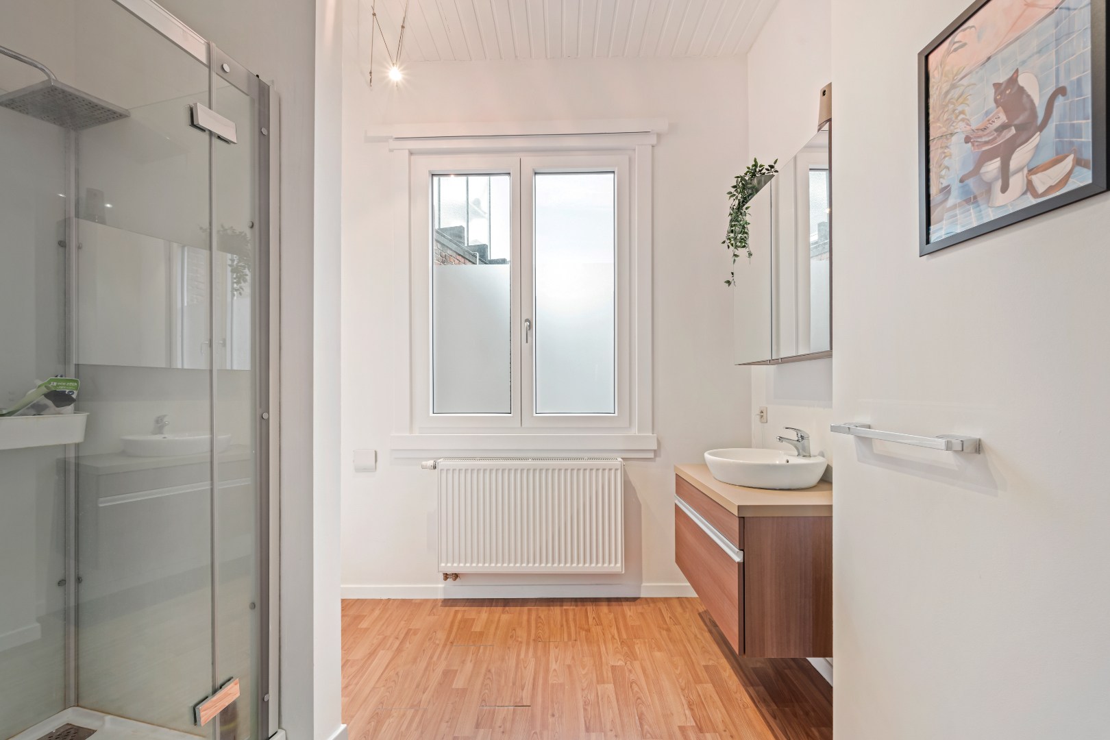 Op de eerste verdieping is er de master bedroom en de badkamer met douche, enkele wastafel in meubel en toilet (ook aansluiting wasmachine en droogkast).