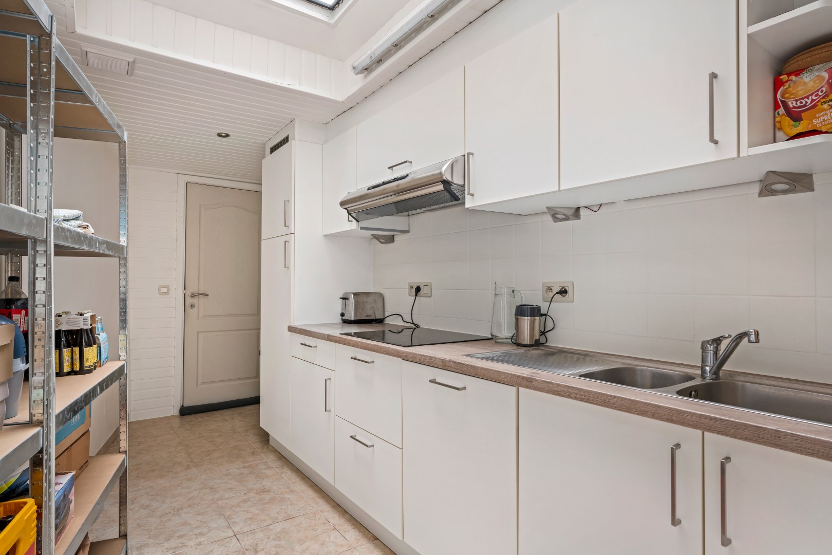 De woning kenmerkt op de benedenverdieping de inkomhal, de lichtrijke woonkamer met aanpalende eetplaats, de keuken (dampkap, ker. kookplaat, vaatwasser, koelkast & dubbele spoelbak) en het apart toilet.