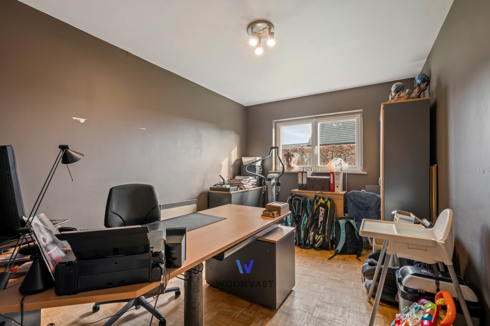 Het gelijkvloers beschikt verder over een stijlvolle badkamer uitgerust met douche, ligbad en lavabo, een afzonderlijk toilet, een eerste ruime slaapkamer en een bureauruimte die perfect kan worden ingericht als tweede slaapkamer. Daarnaast is er een dubbele garage met aansluitende wasruimte.