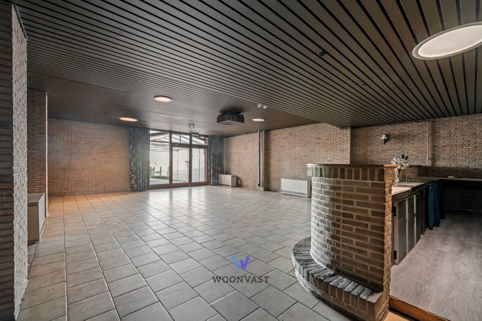 Het bijgebouw bestaat uit een grote open ruimte (voormalig café), een badkamer, een achterliggende keuken, stallingen en een ruime kamer met uitzicht op de tuin.