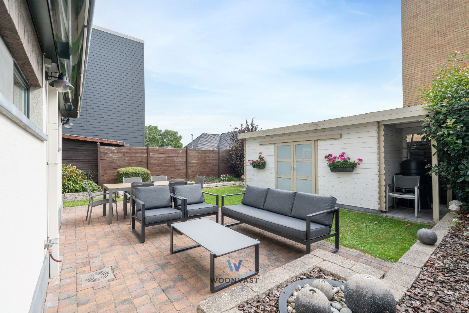Als kers op op de taart is er de zonnige tuin met aangelegd terras (met zonneluifel) en tuinhuis. Deze is ook langs de zijkant van de woning te bereiken.