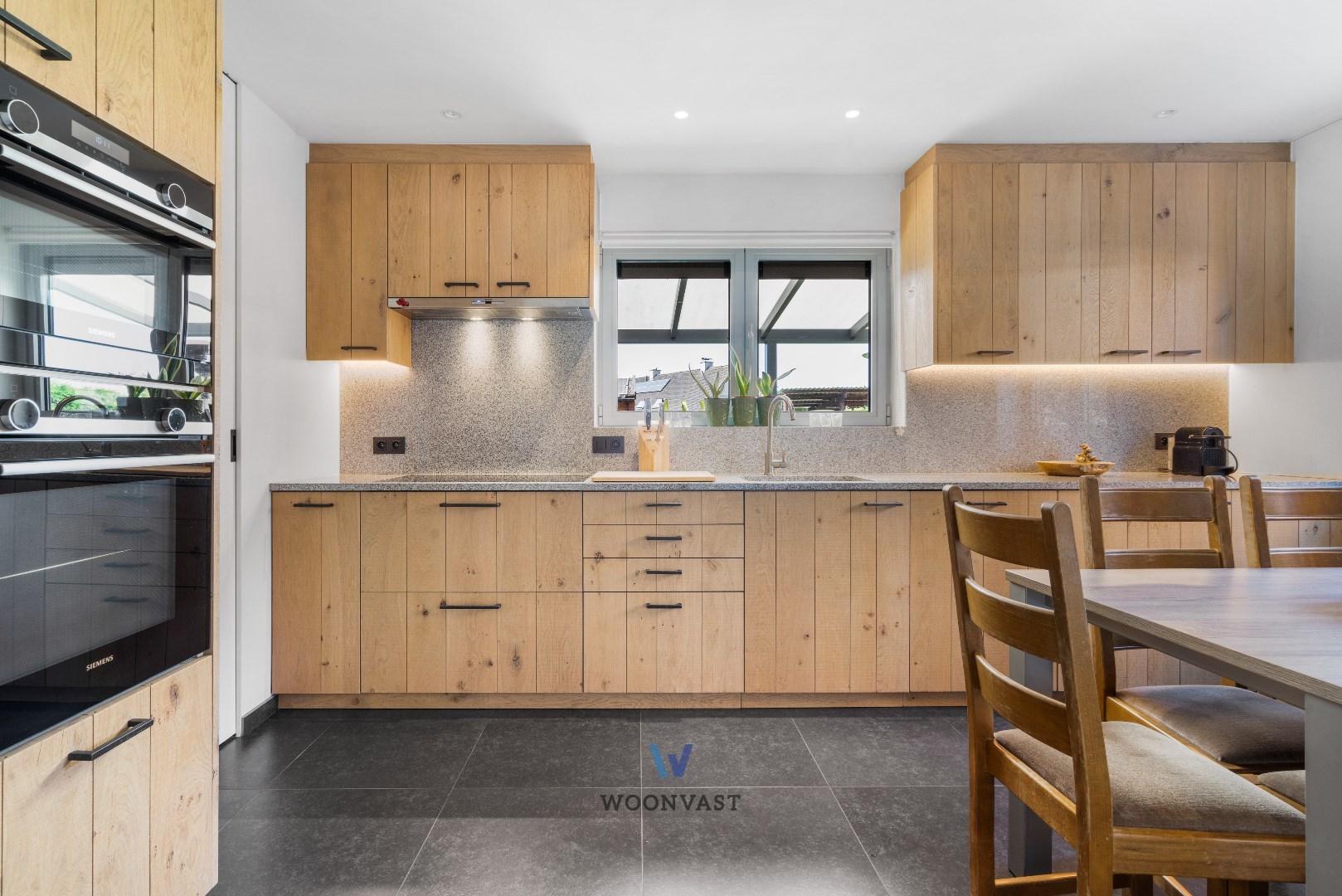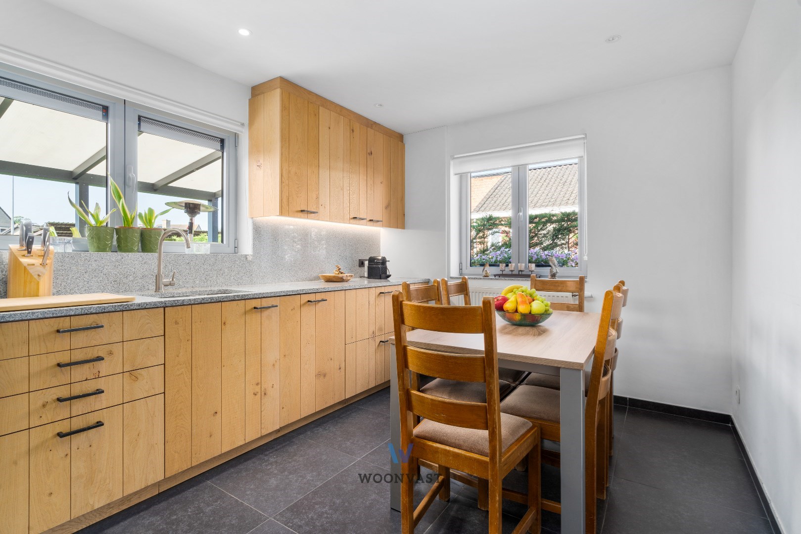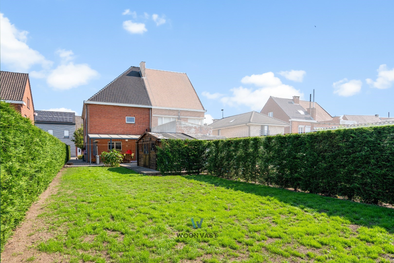 Via de keuken bereik je de handige berging/wasplaats (7m2) met aansluitingen voor wasmachine/droogkast/extra frigo/waterontharder. Via de achterdeur heb je verder toegang tot de pergola (25m2 - in 2016 gebouwd) die de verbinding met de zuid georiënteerde tuin maakt.