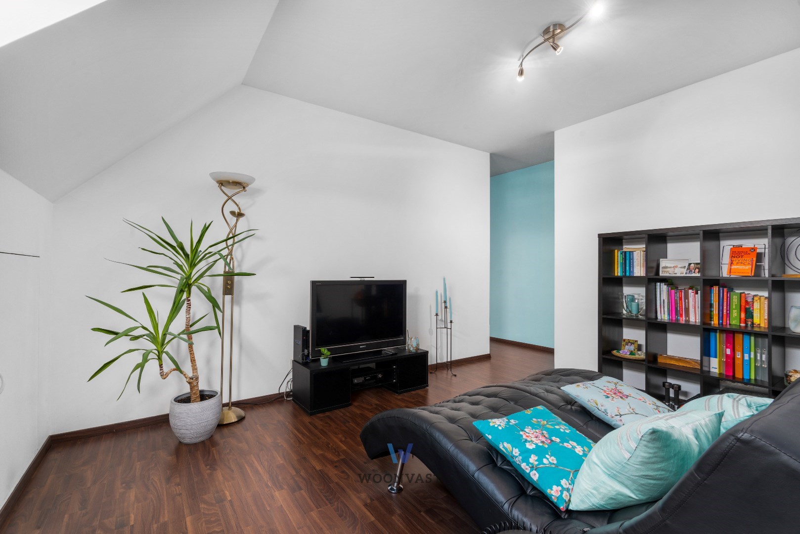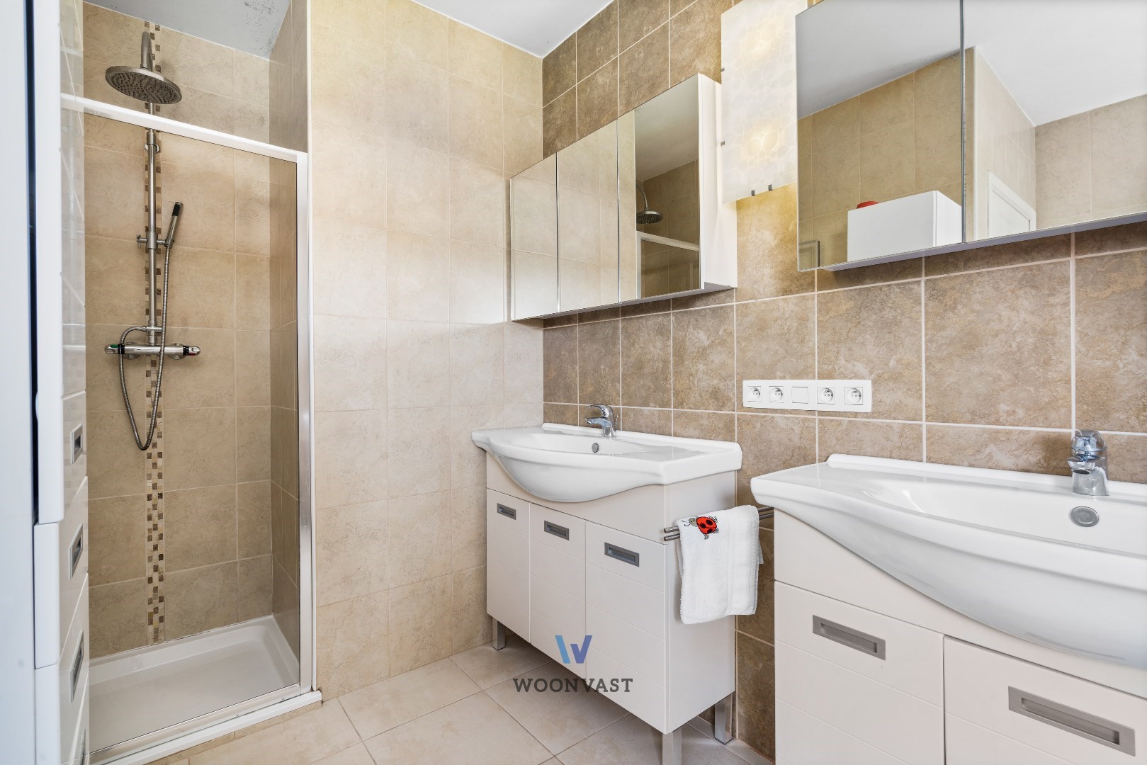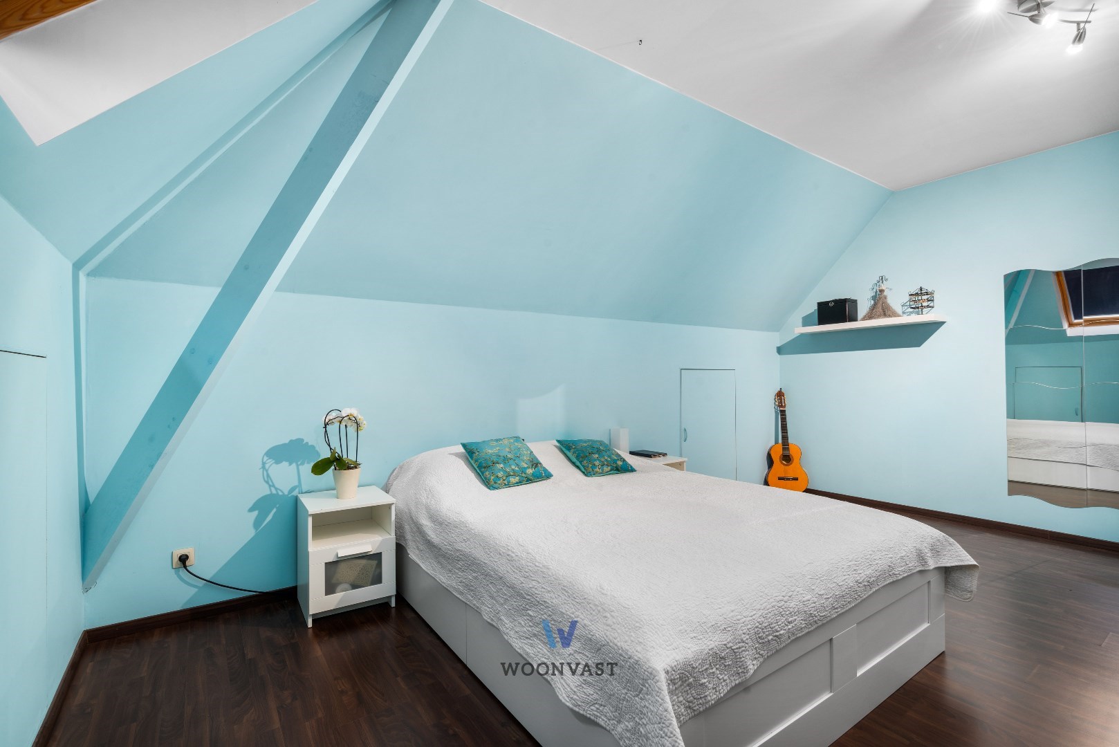 Op de tweede verdieping en onder het dak vinden we nog twee grote slaapkamers (23 m2), (16 m2) die momenteel als aparte wooneenheid met slaapkamer en living ingericht is. De zijmuren op gans deze verdieping zijn met handige extra opbergkasten op maat afgewerkt.