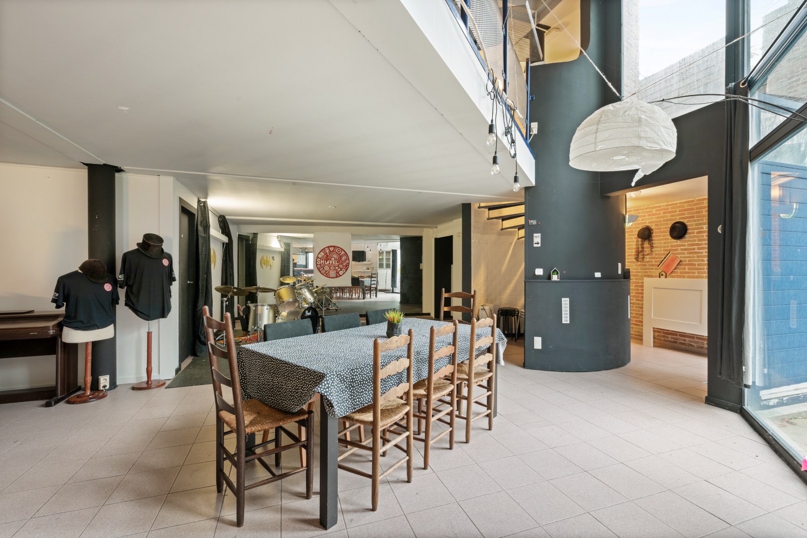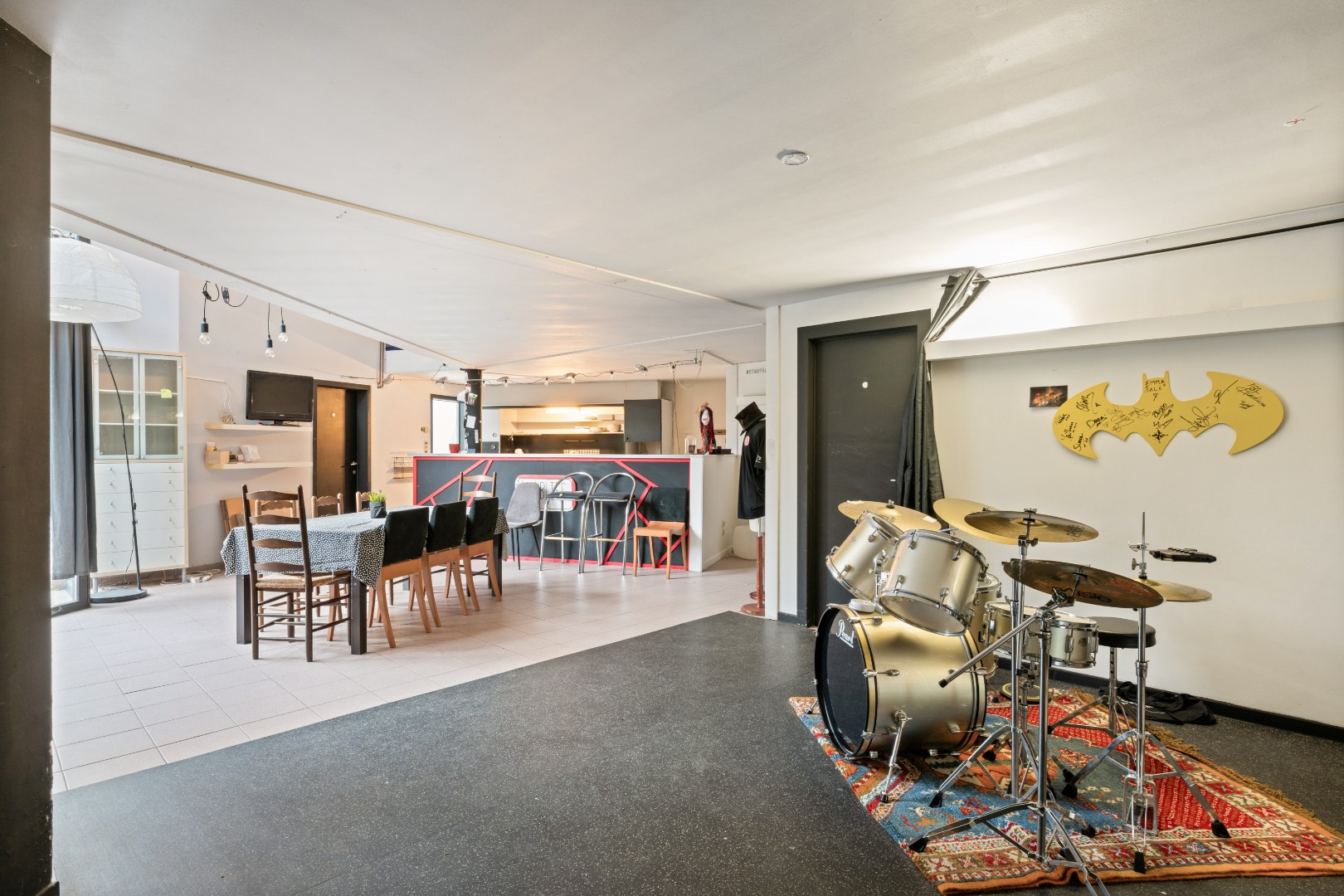 Achteraan bevindt zich een polyvalente ruimte met aparte toegang, momenteel ingericht als repetitieruimte met bar. Deze ruimte leent zich uitstekend voor een praktijk, atelier, kantoor aan huis, studio of kangoeroe-/cohousingconcept.