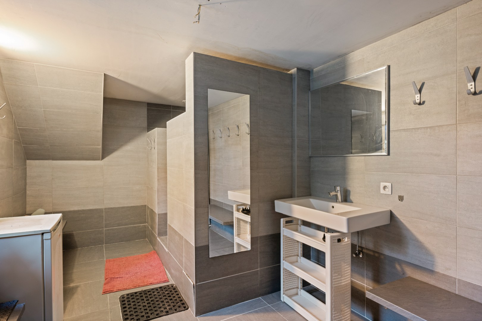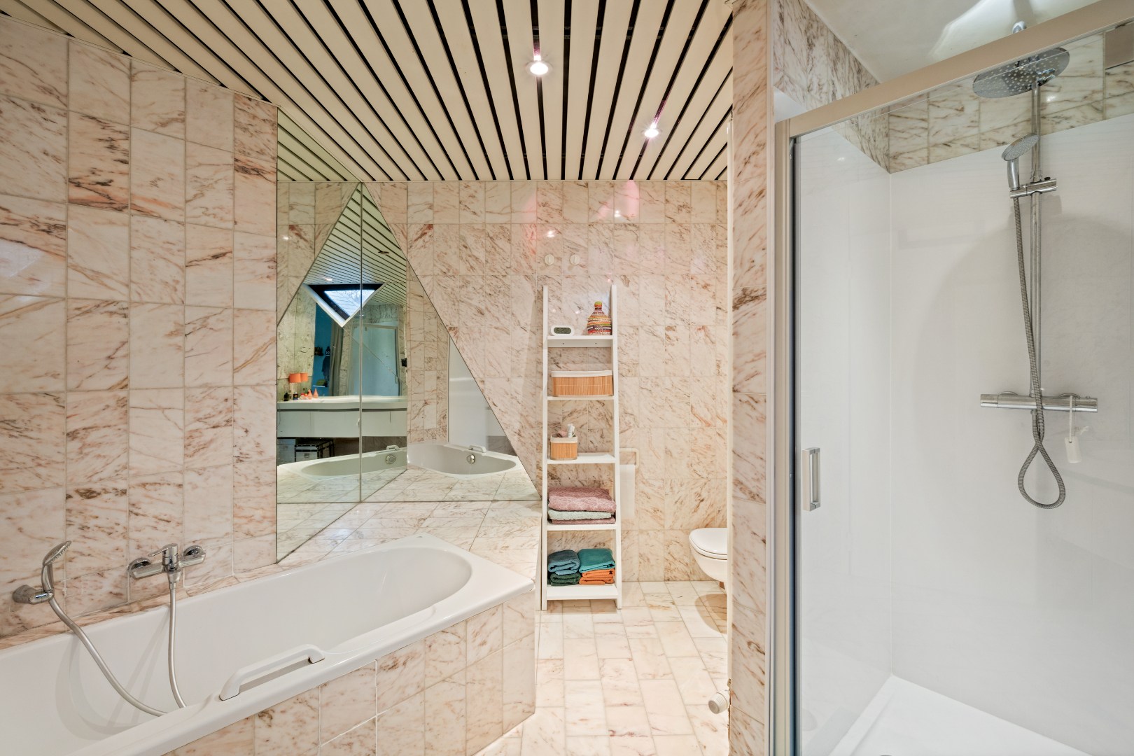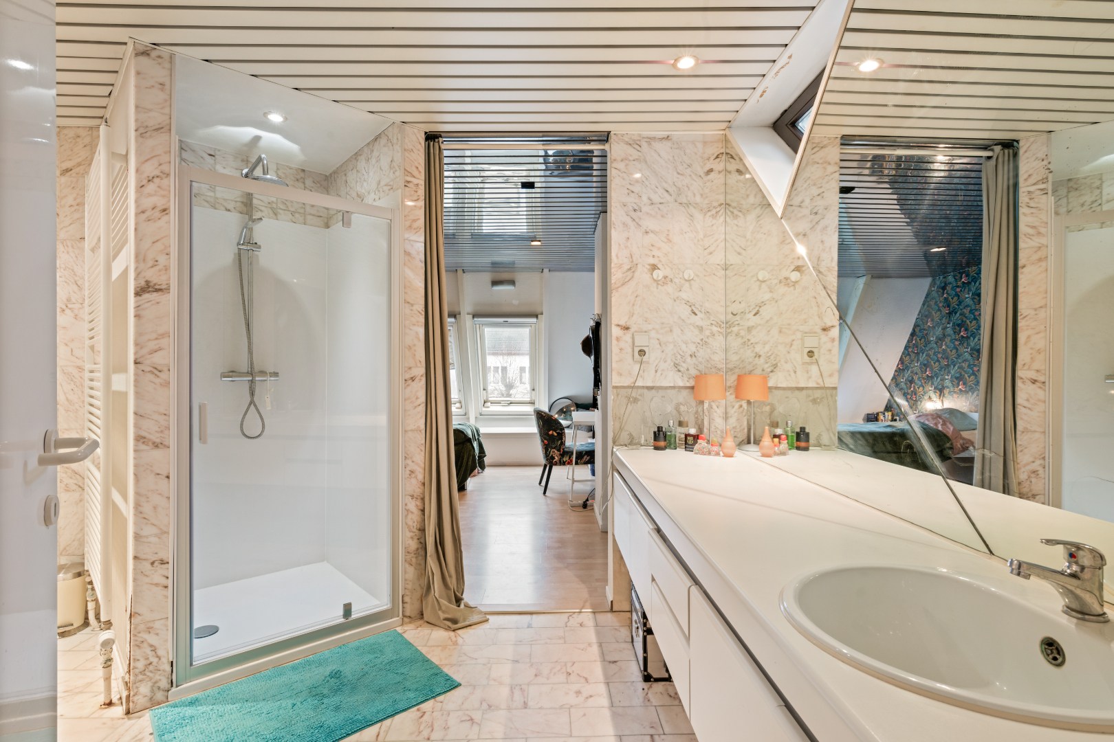 De woning onderscheidt zich door haar speelse niveauverschillen, overvloedige lichtinval en authentieke architecturale structuur. De indeling omvat een ruime leefruimte met open haard, een volledig ingerichte keuken, bureau, 4 volwaardige slaapkamers en 2 badkamers. Hoewel bepaalde ruimtes baat hebben bij een lichte opfrissing, vormt dit pand een bijzonder sterke basis om naar eigen smaak verder te verfijnen.