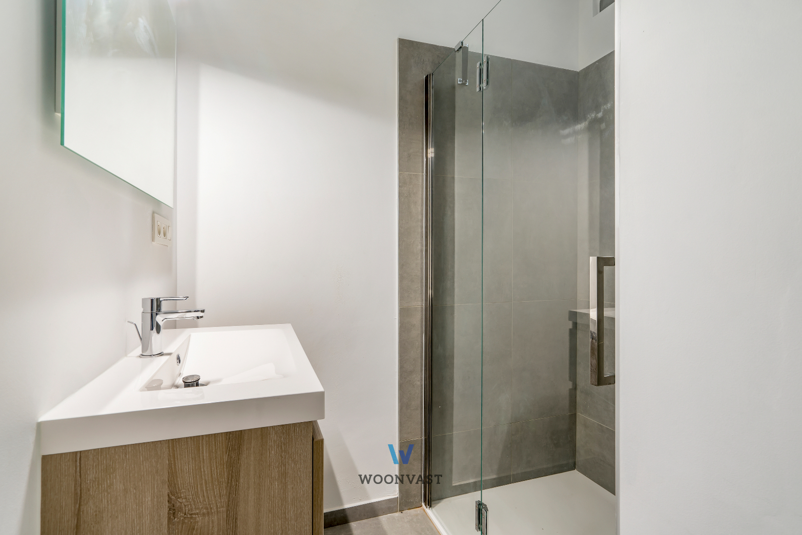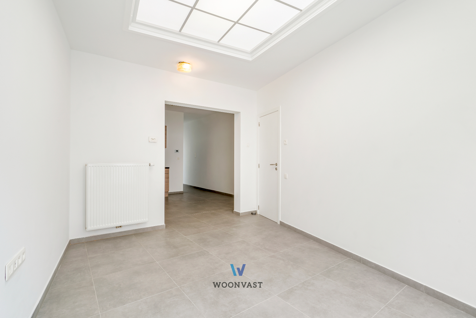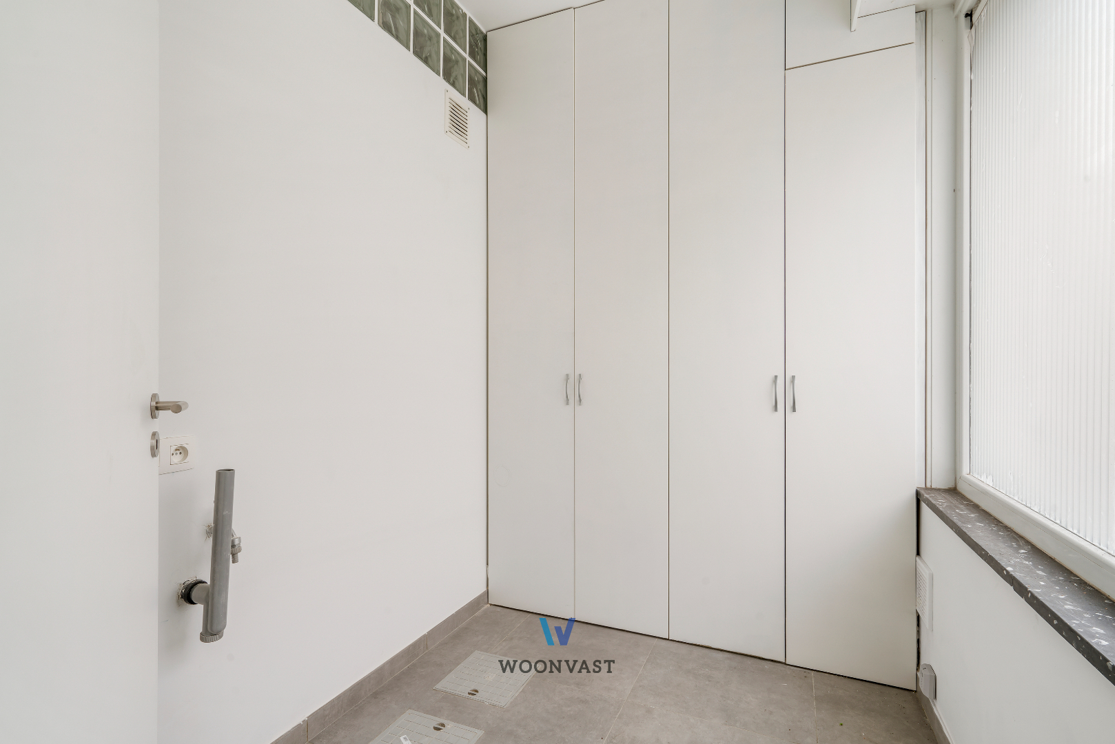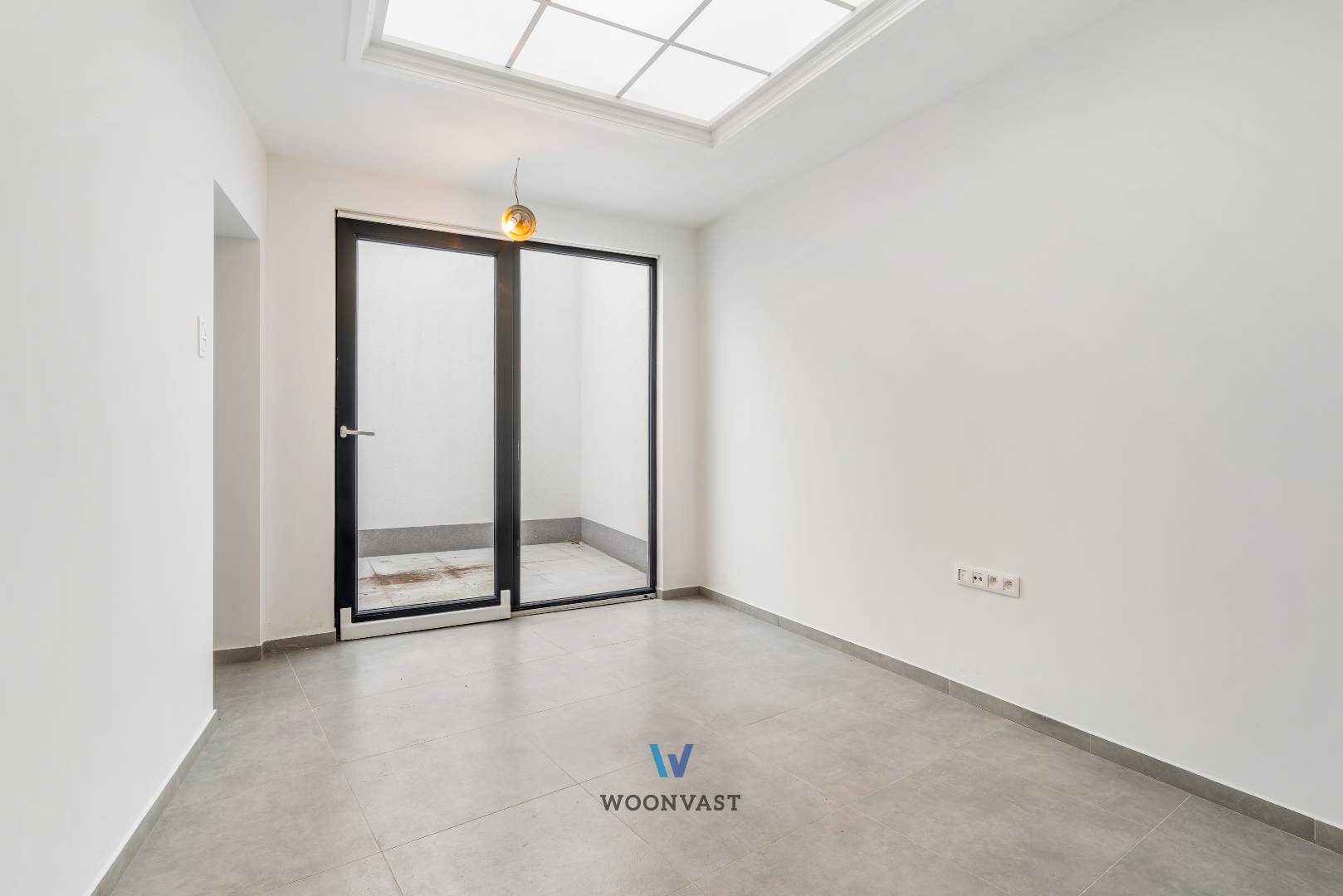 Glv: Je betreedt deze woning via de centrale inkomhal, die toegang verleent tot de berging met aansluitingen voor wasmachine/droogkast, de badkamer voorzien van inloopdouche en lavabomeubel, een apart toilet alsook de keuken voorzien van het nodige comfort. Aansluitend bevindt zich de lichtrijke leefruimte die rechtstreeks toegang geeft tot de stadskoer.