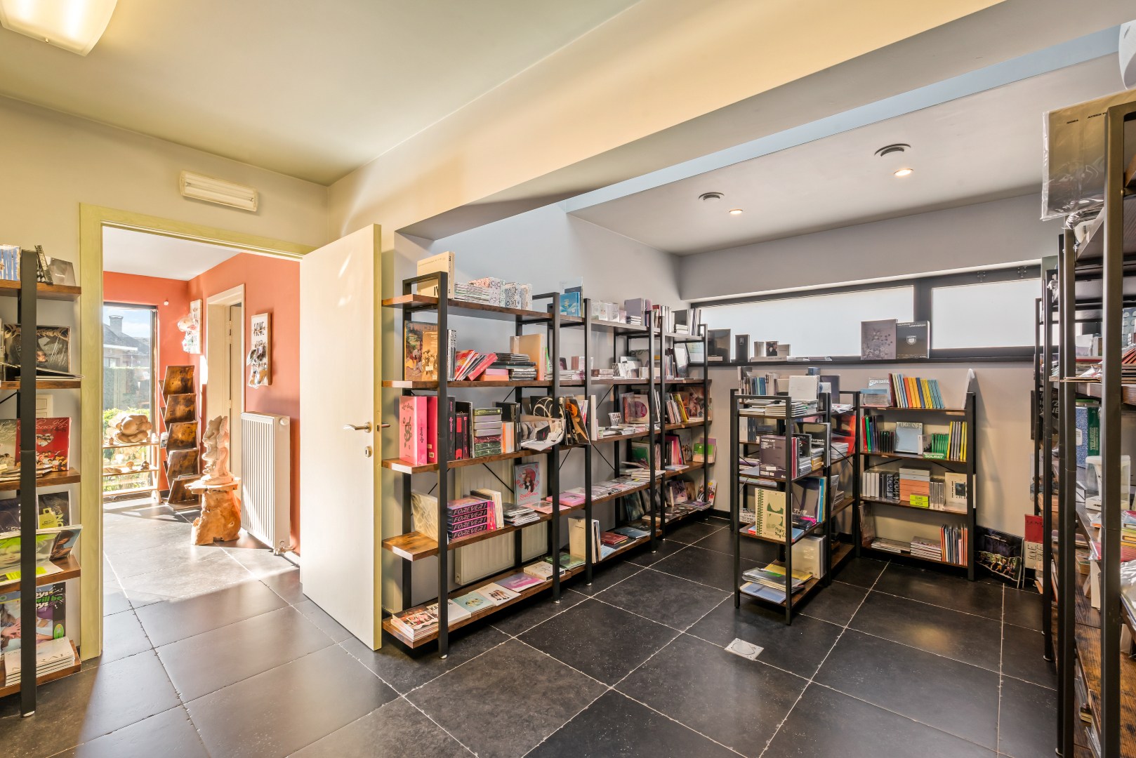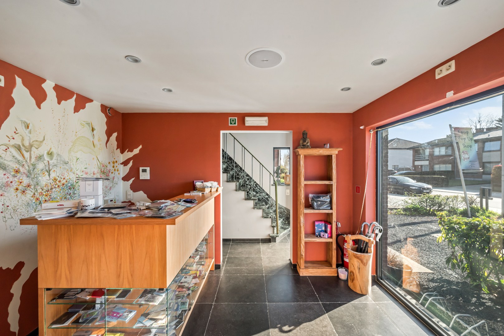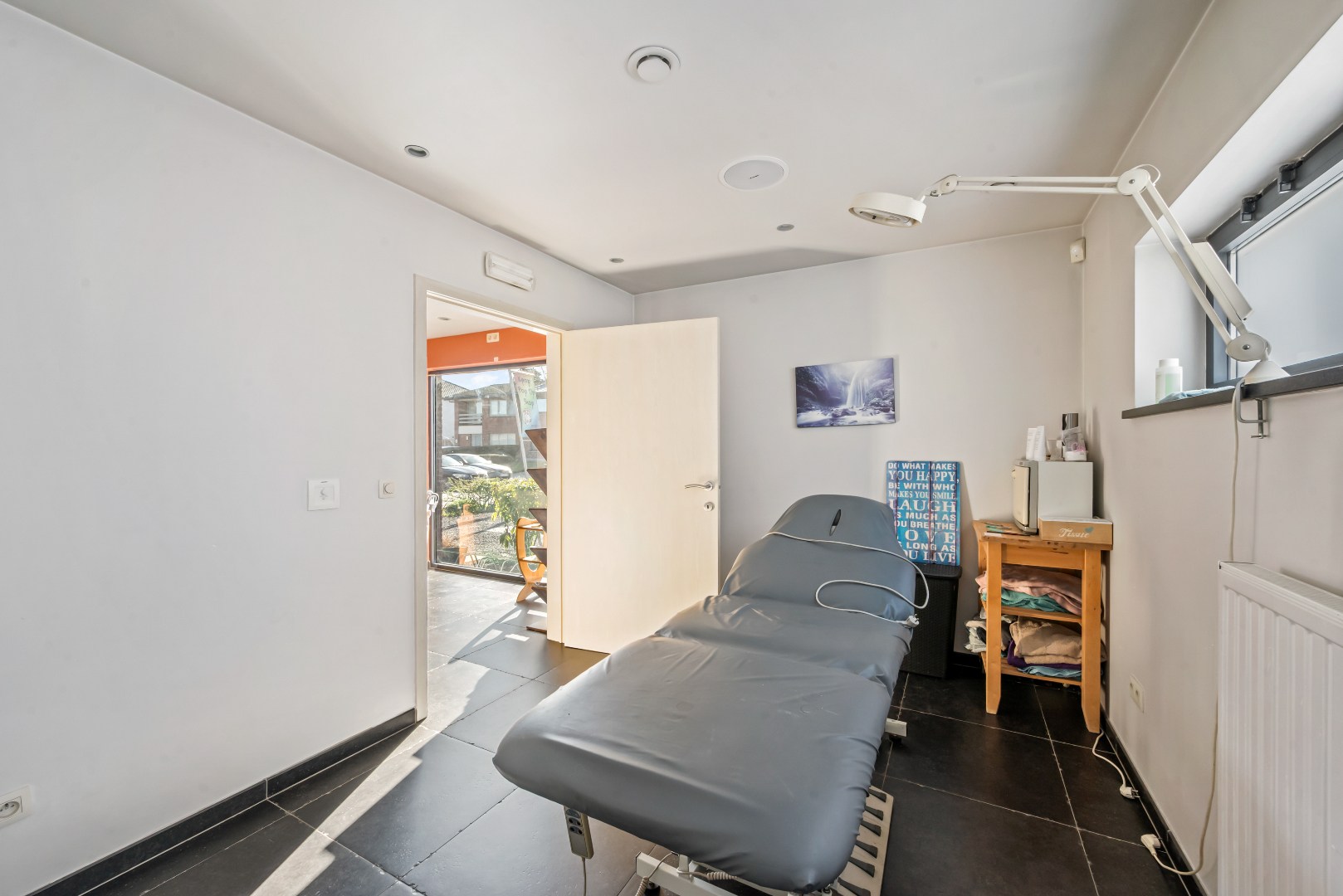 Bij het binnenkomen valt meteen de praktische indeling op. Op het gelijkvloers bevindt zich een ruime praktijk- of hobbyruimte, ingedeeld in meerdere zones. Ideaal voor zelfstandigen of wie wonen en werken wil combineren, met behoud van privacy. Verder beschikt de woning over praktische bergruimtes en meerdere afzonderlijke toiletten.