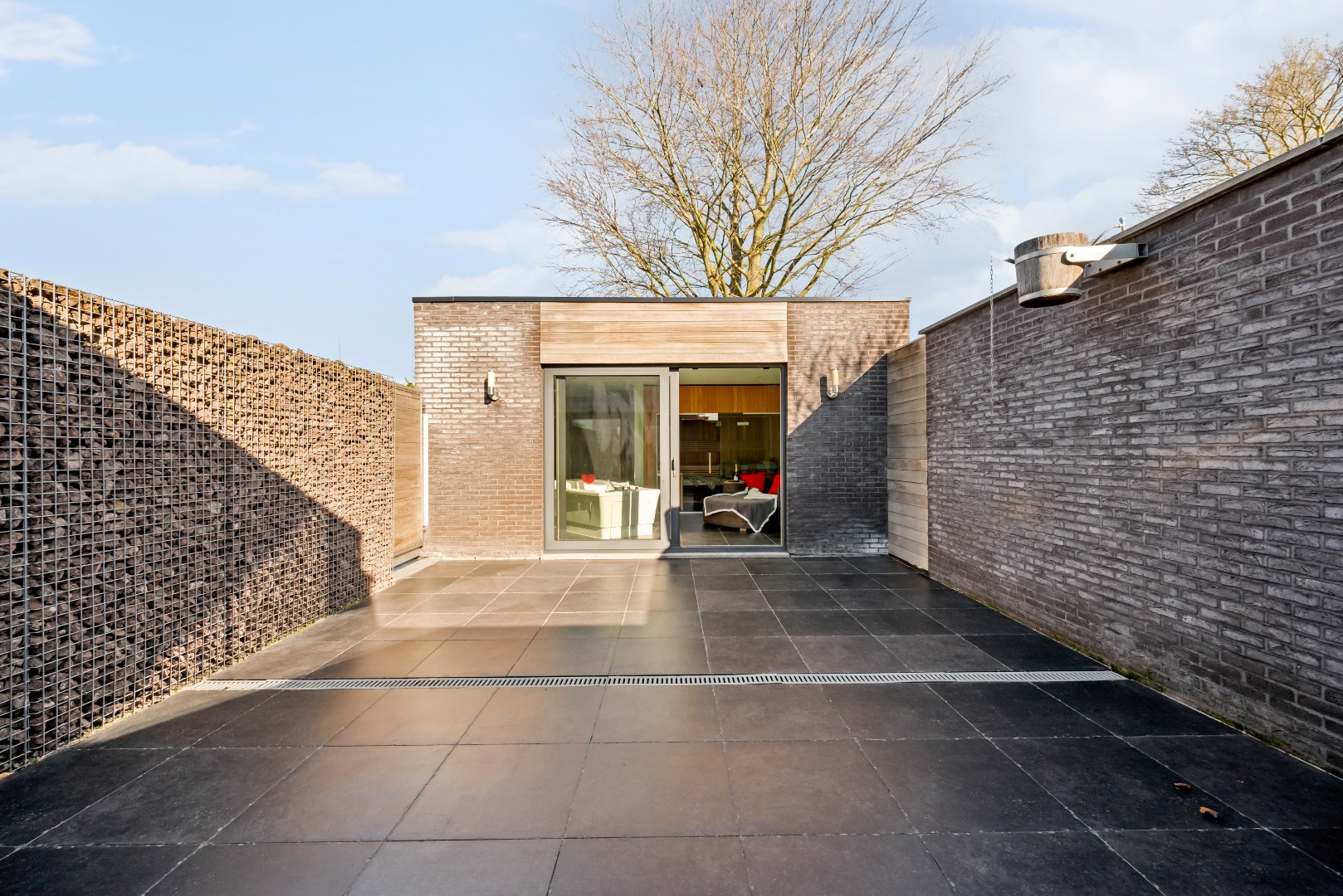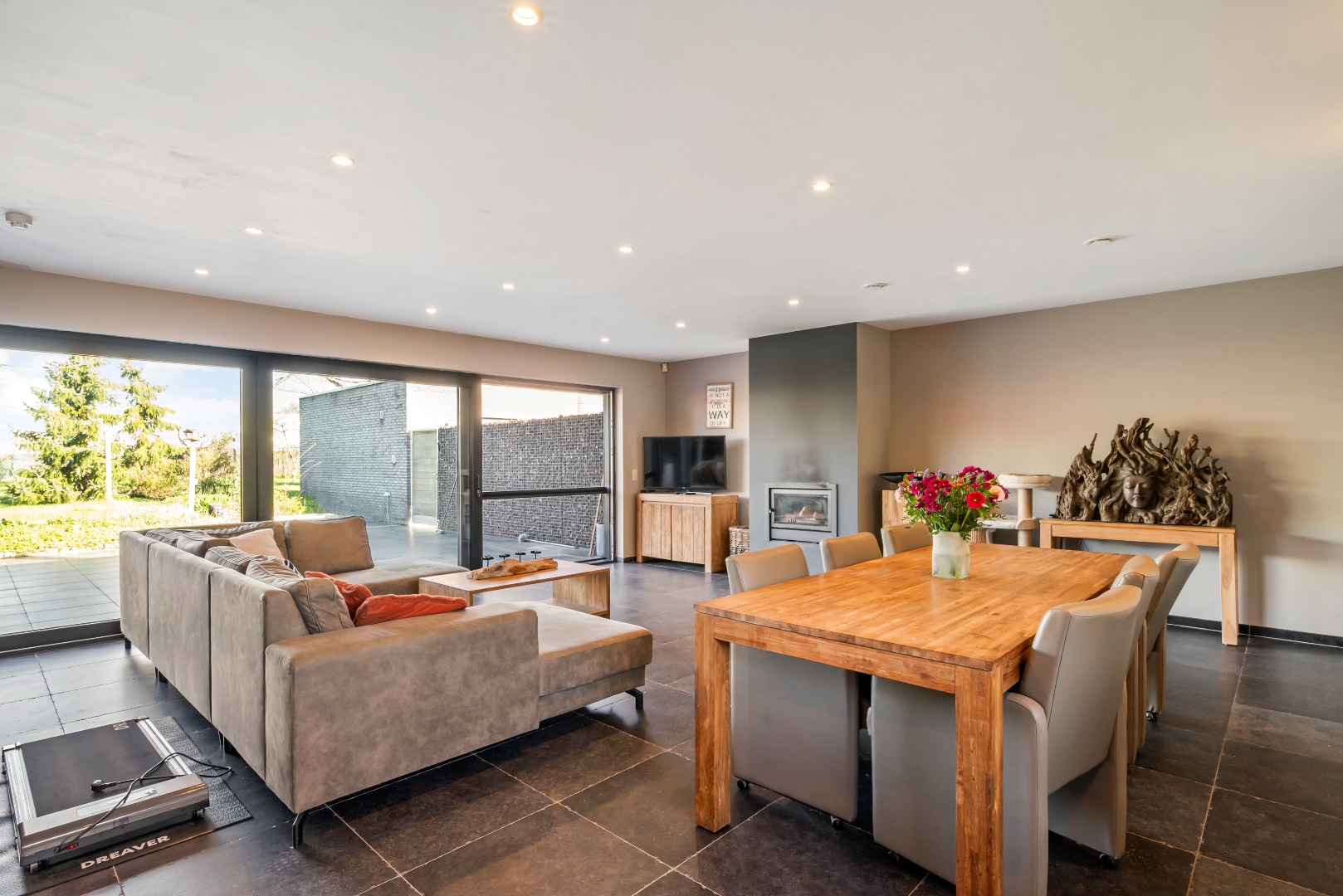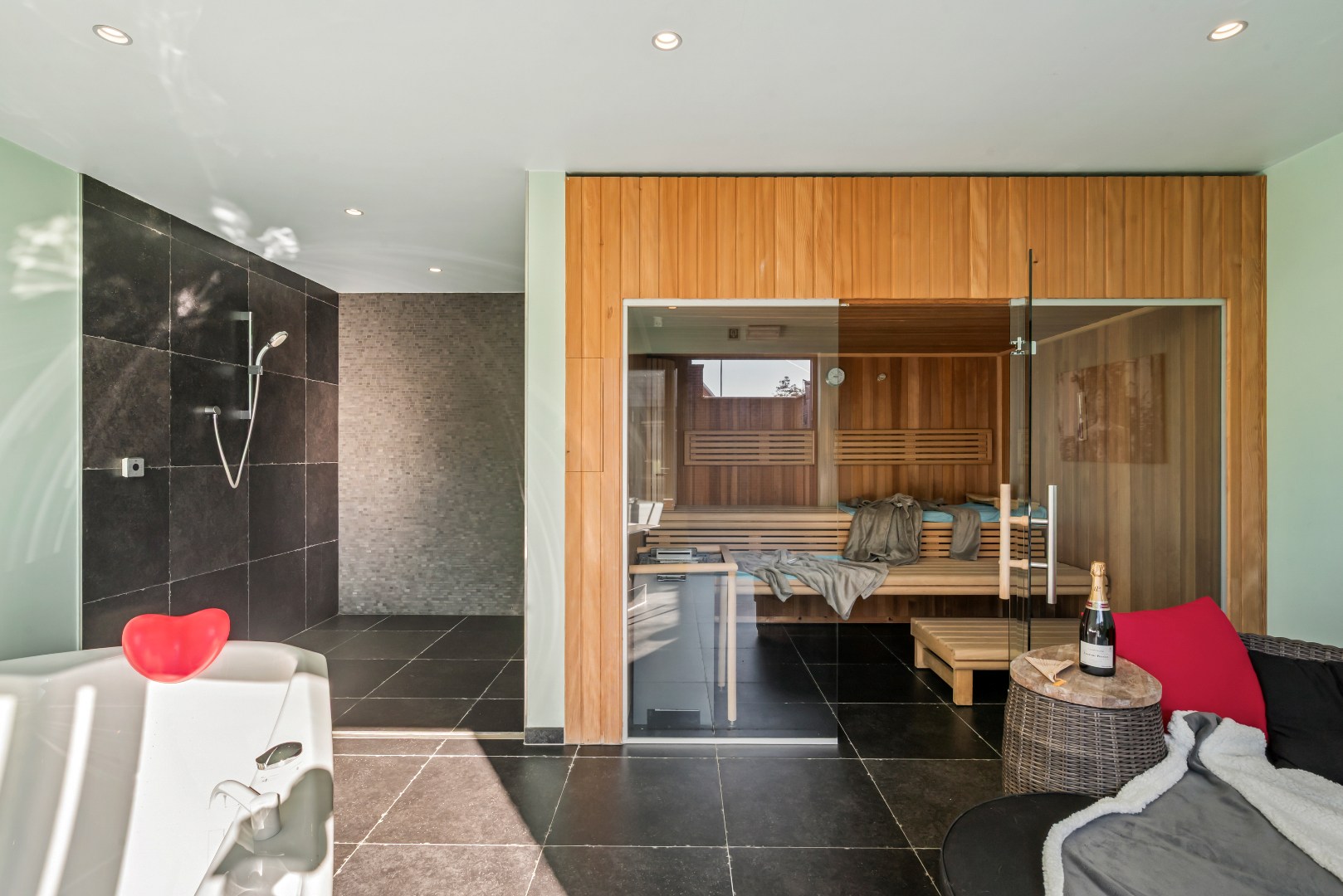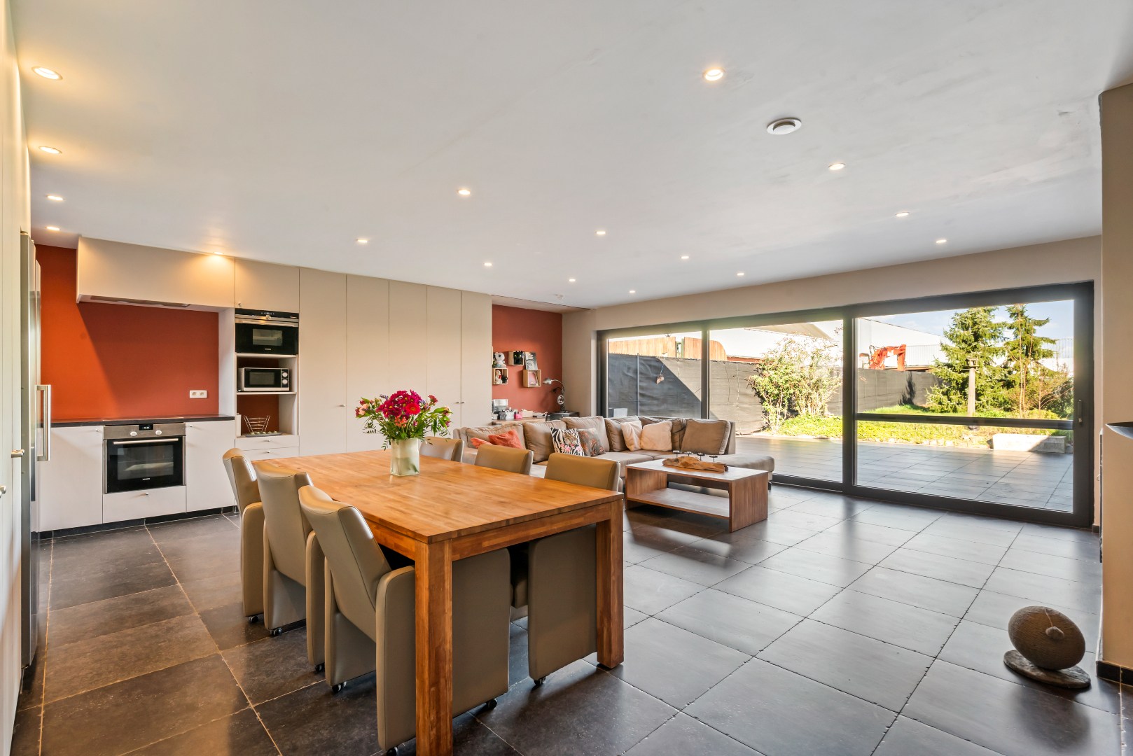 De lichtrijke leefruimte met open, volledig uitgeruste keuken vormt het hart van de woning en geeft via een groot schuifraam rechtstreeks uit op het zonnige terras en de tuin, waar het aangenaam vertoeven is. Achteraan bevindt zich een polyvalente ruimte met inloopdouches en een aparte wellnesszone met sauna en privéterras. Een echte meerwaarde voor wie op zoek is naar ontspanning in eigen huis.