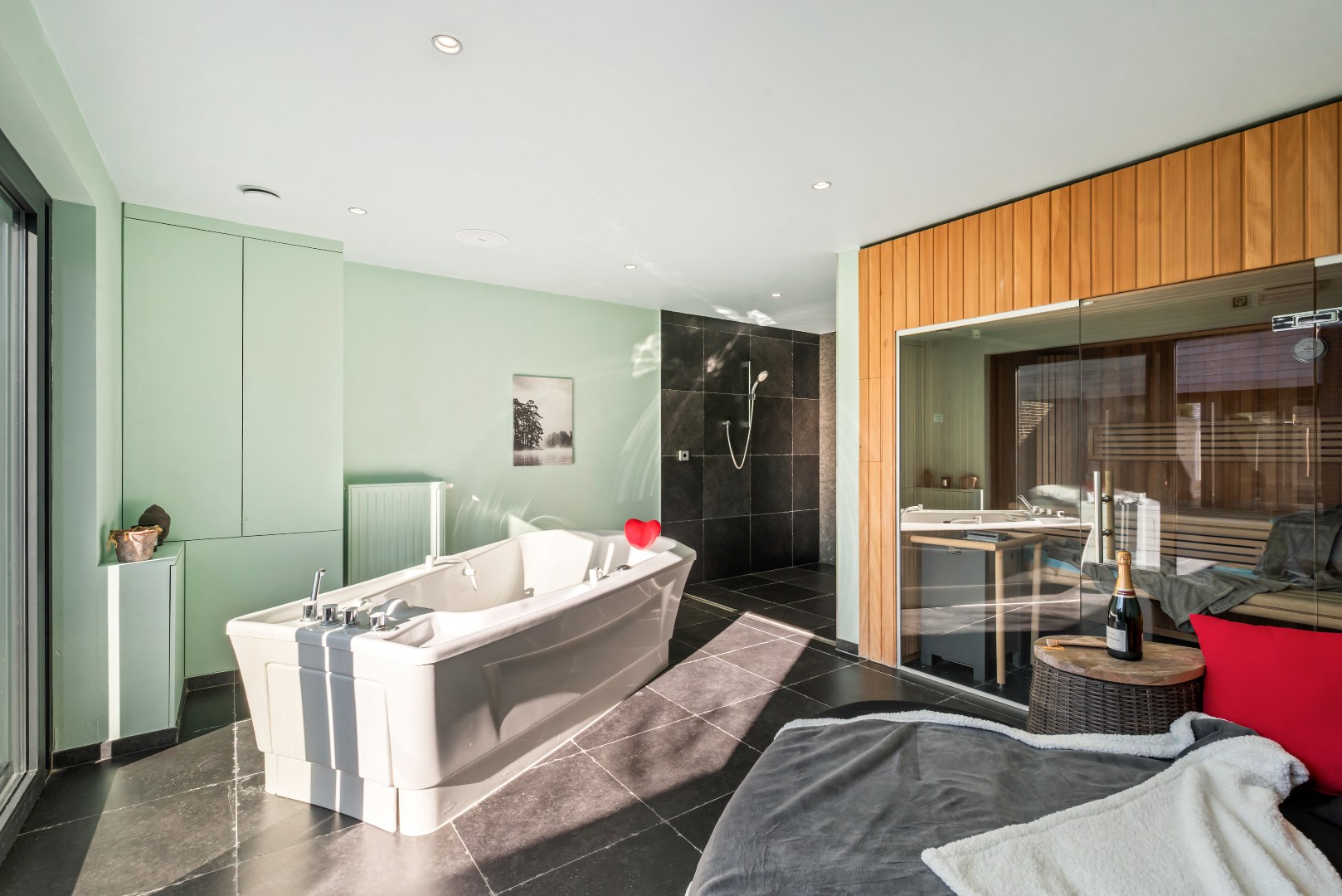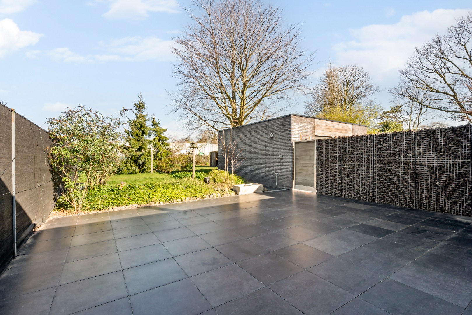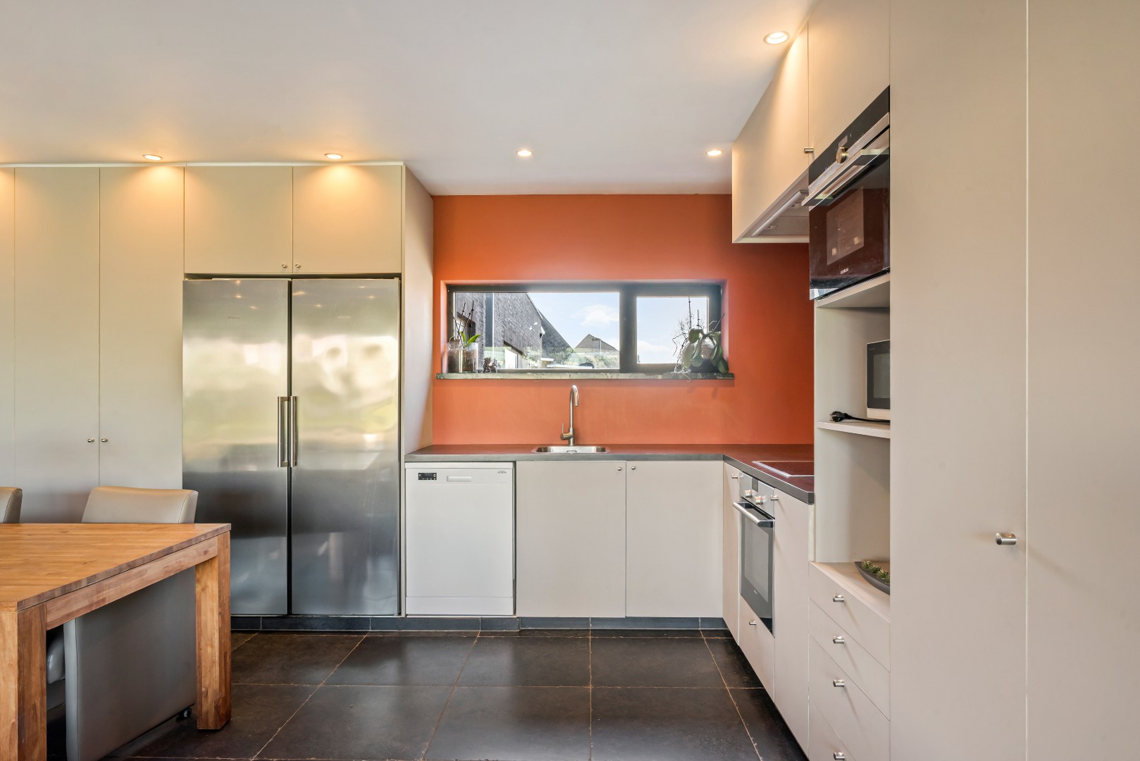 De lichtrijke leefruimte met open, volledig uitgeruste keuken vormt het hart van de woning en geeft via een groot schuifraam rechtstreeks uit op het zonnige terras en de tuin, waar het aangenaam vertoeven is. Achteraan bevindt zich een polyvalente ruimte met inloopdouches en een aparte wellnesszone met sauna en privéterras. Een echte meerwaarde voor wie op zoek is naar ontspanning in eigen huis.
