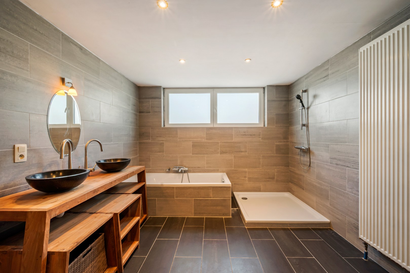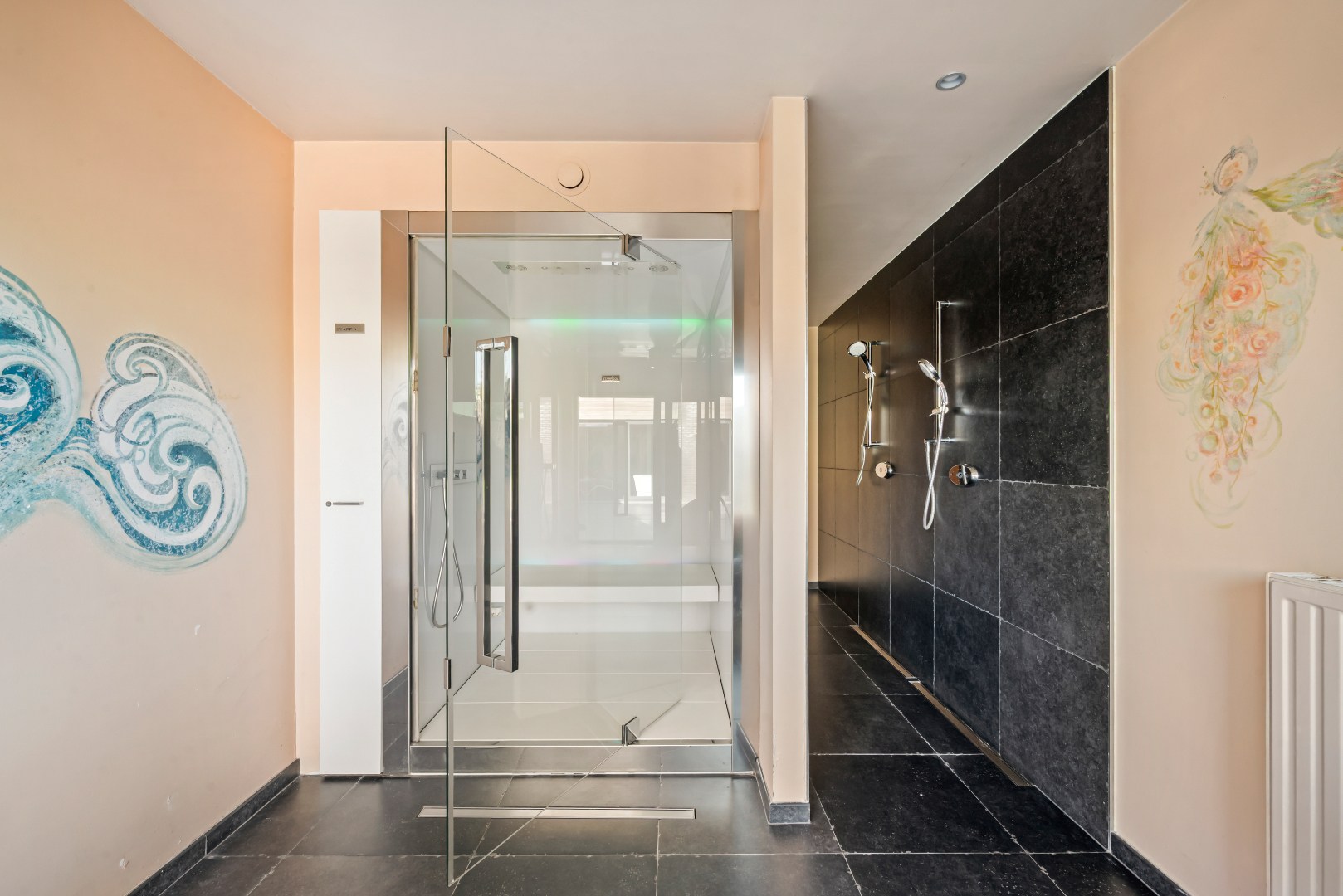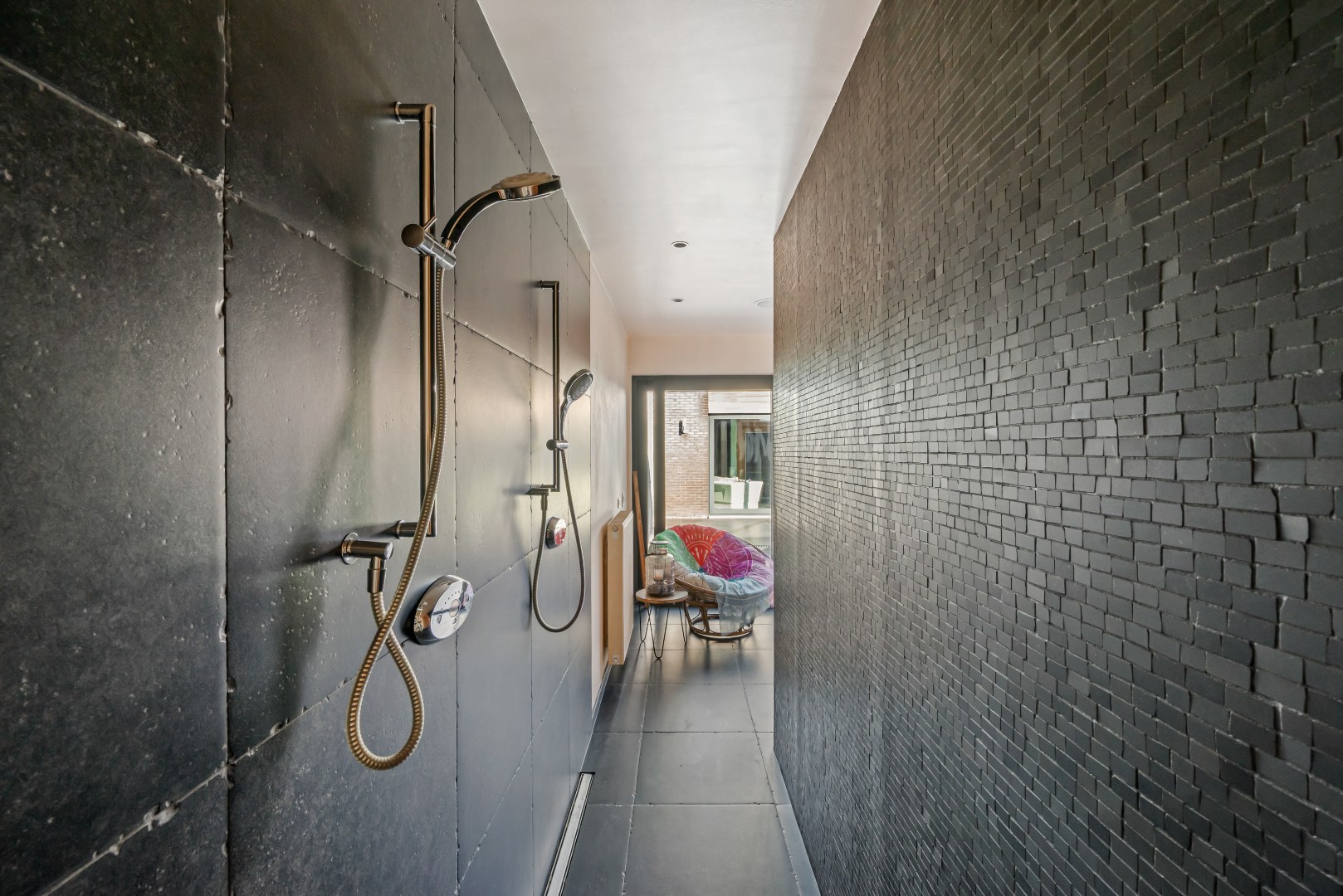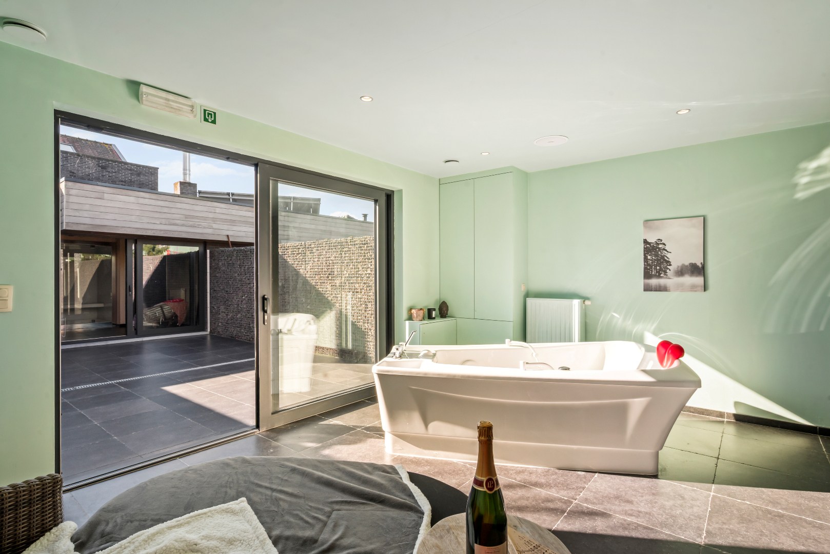 De lichtrijke leefruimte met open, volledig uitgeruste keuken vormt het hart van de woning en geeft via een groot schuifraam rechtstreeks uit op het zonnige terras en de tuin, waar het aangenaam vertoeven is. Achteraan bevindt zich een polyvalente ruimte met inloopdouches en een aparte wellnesszone met sauna en privéterras. Een echte meerwaarde voor wie op zoek is naar ontspanning in eigen huis.