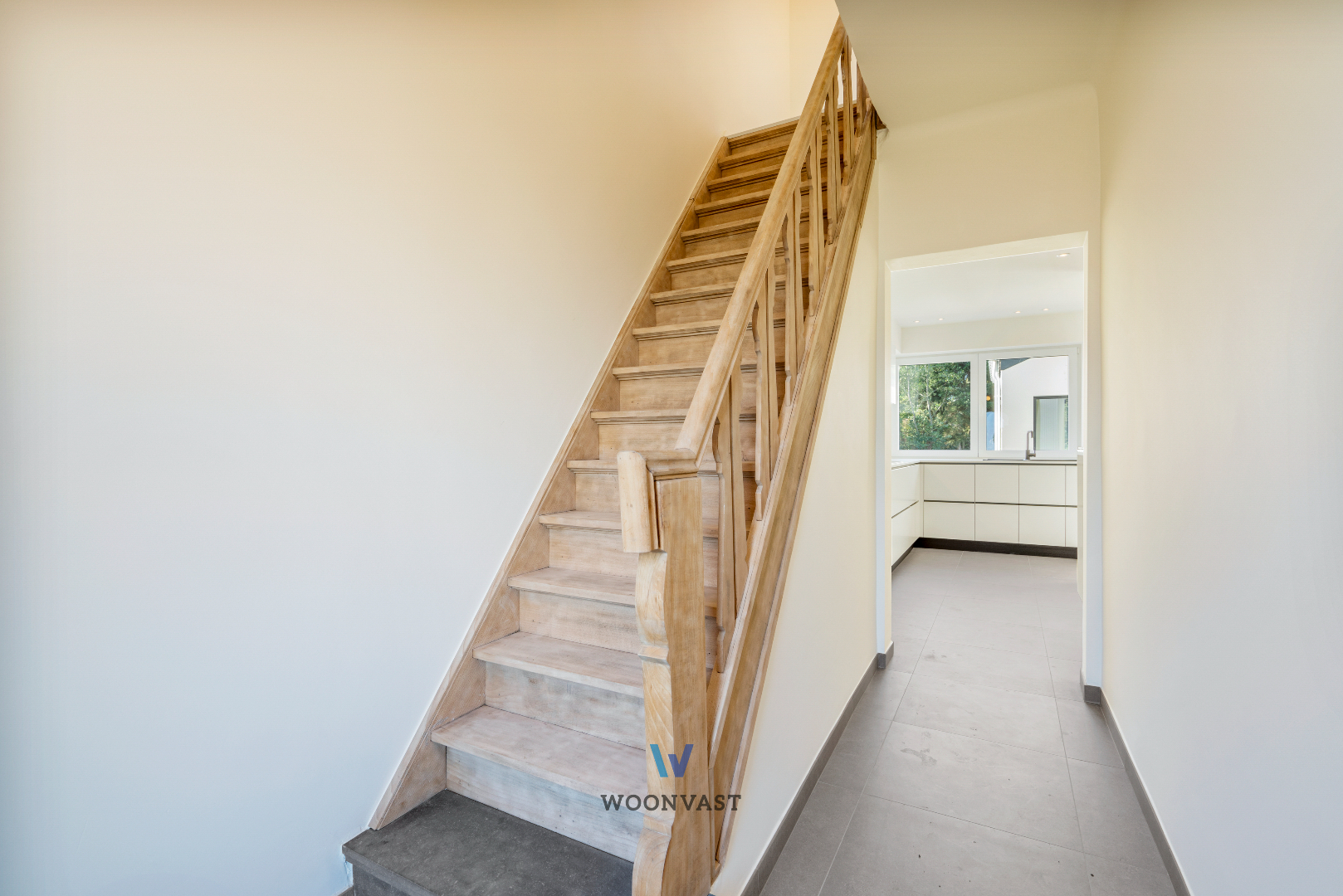 GLV: Je betreedt deze woning via de inkomhal die toegang verleent tot de keuken. De keuken werd uitgerust met alle comfort en heeft tevens een directe connectie met de lichtrijke leefruimte. De leefruimte straalt één en al gezelligheid uit, de hoge plafonds en de hoge ramen zorgen voor een unieke beleving. Via de leefruimte betreedt je ook de zuidwest georiënteerde tuin.