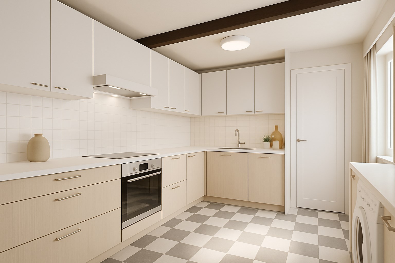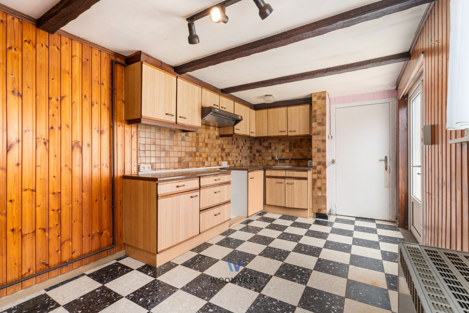 Naast de leefruimte komen we terecht in de ruime keuken waarnaast een wasplaats en een bergruimte grenst.