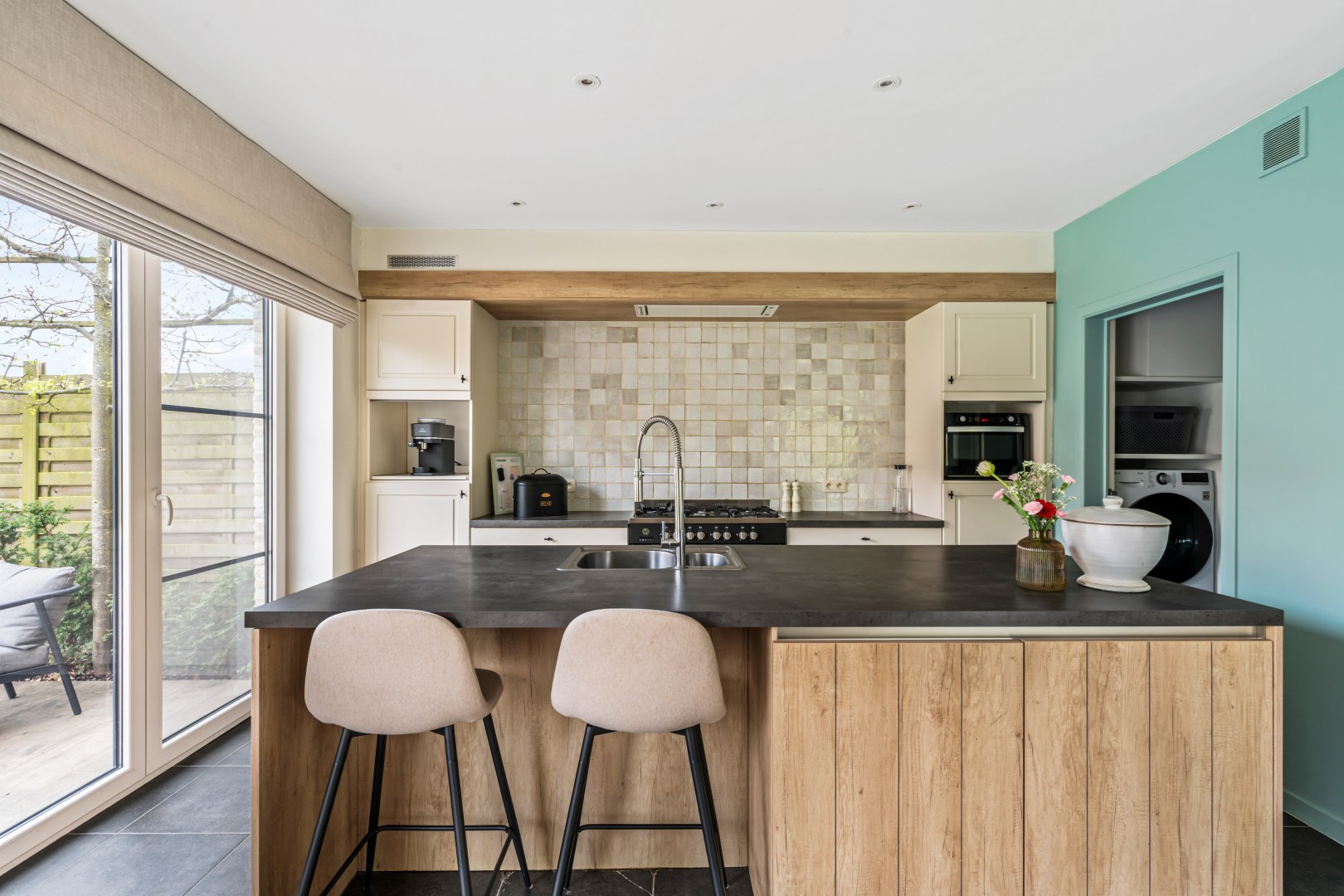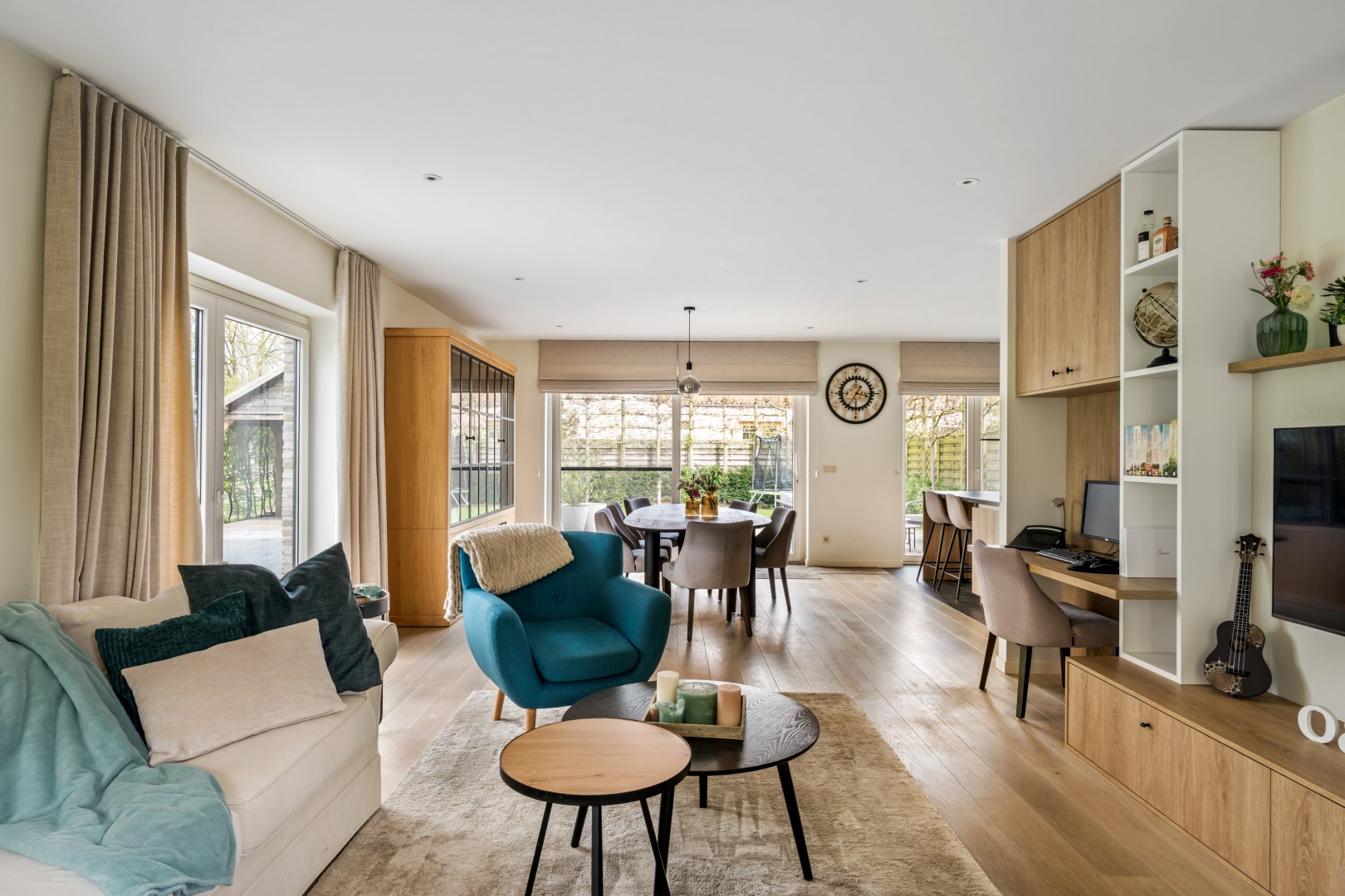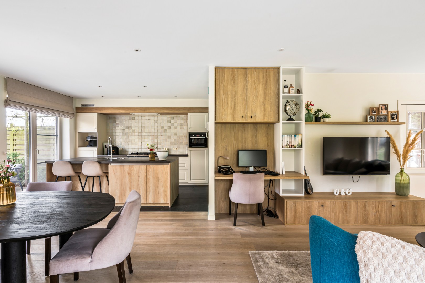 GLV: Je betreedt de woning via de inkomhal met apart toilet die toegang verleent tot de ruime en lichtrijke leefruimte. De living loopt naadloos over in de eethoek en de volledig uitgeruste open keuken — een echte blikvanger met maatwerk in eik en krijtkleur, een kookeiland met bar, professioneel gasfornuis en een karakteristiek handgemaakt tegelpaneel. Grote schuifdeuren verbinden de leefruimte rechtstreeks met het zonnige terras en de tuin. Een geïntegreerde bureauhoek en stijlvolle kastenwand op maat maken het geheel compleet.