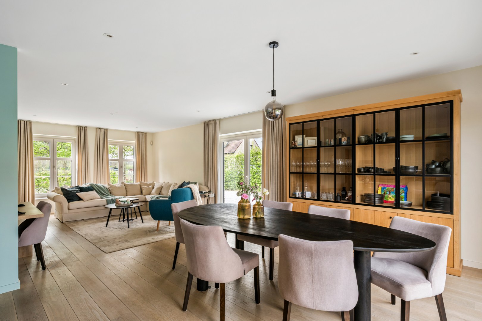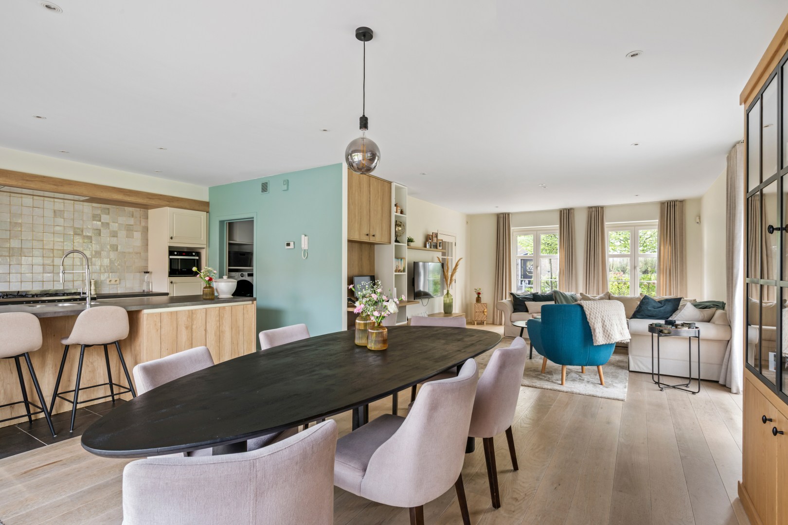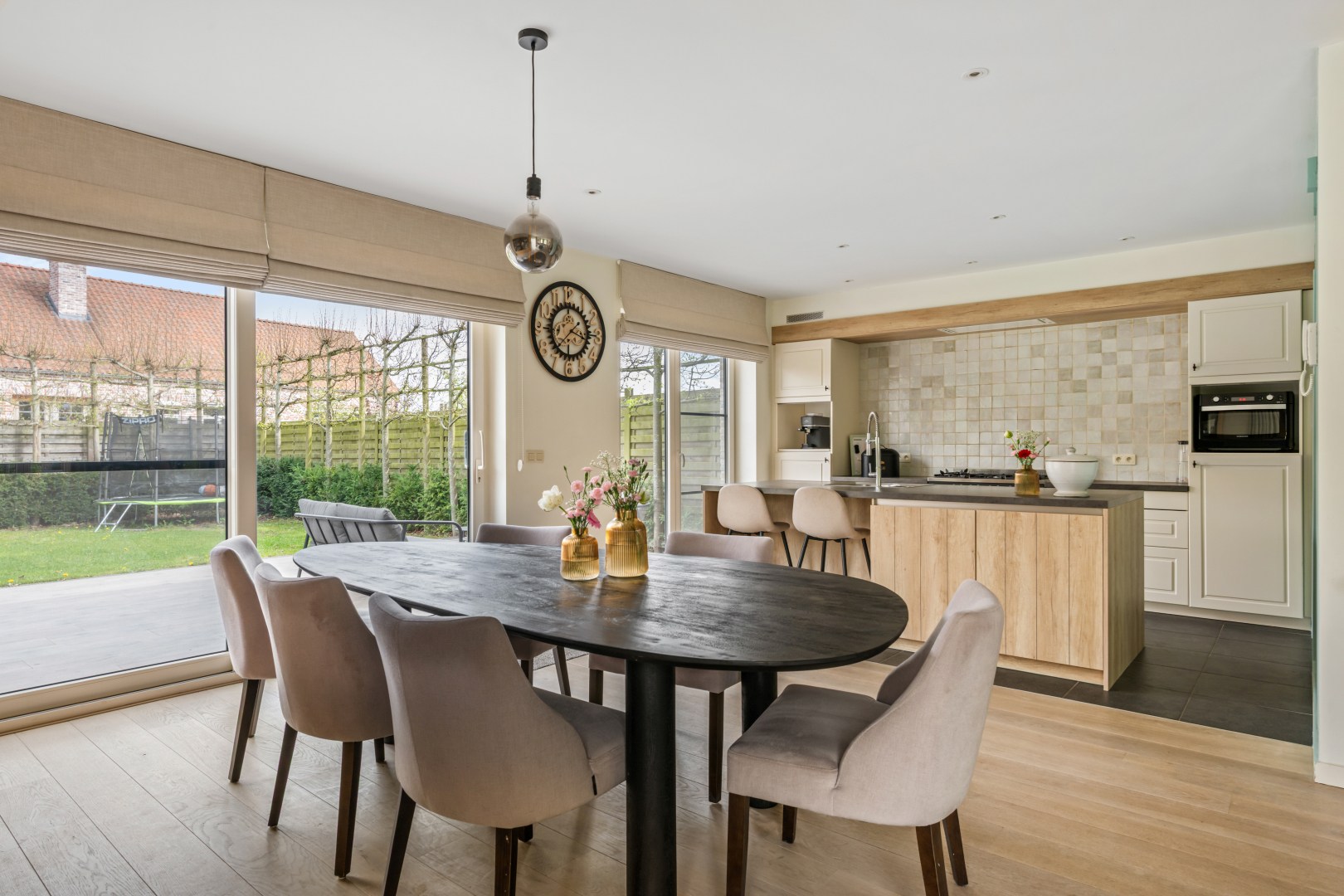 GLV: Je betreedt de woning via de inkomhal met apart toilet die toegang verleent tot de ruime en lichtrijke leefruimte. De living loopt naadloos over in de eethoek en de volledig uitgeruste open keuken — een echte blikvanger met maatwerk in eik en krijtkleur, een kookeiland met bar, professioneel gasfornuis en een karakteristiek handgemaakt tegelpaneel. Grote schuifdeuren verbinden de leefruimte rechtstreeks met het zonnige terras en de tuin. Een geïntegreerde bureauhoek en stijlvolle kastenwand op maat maken het geheel compleet.
