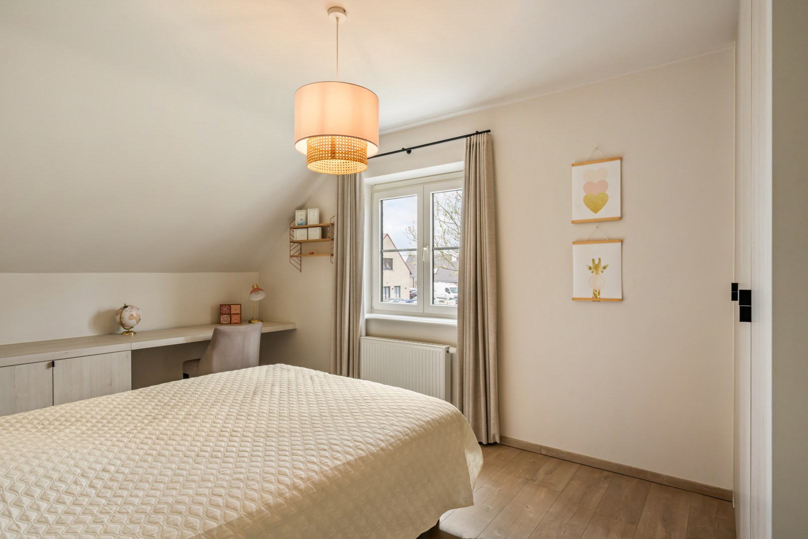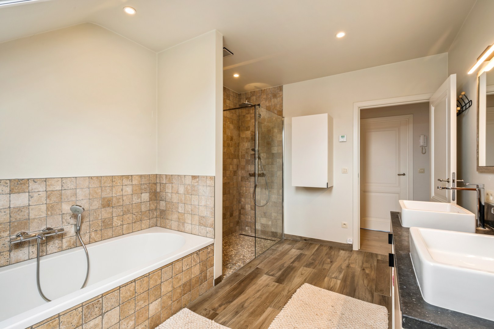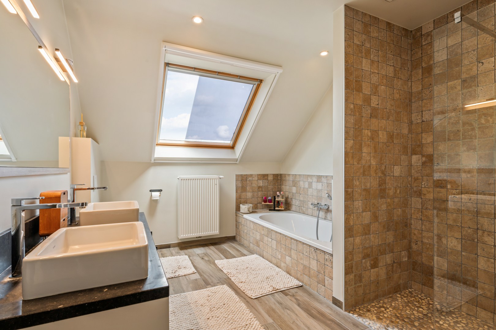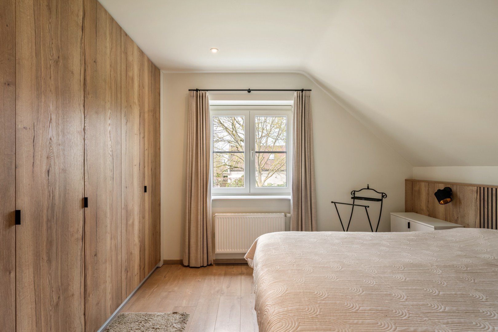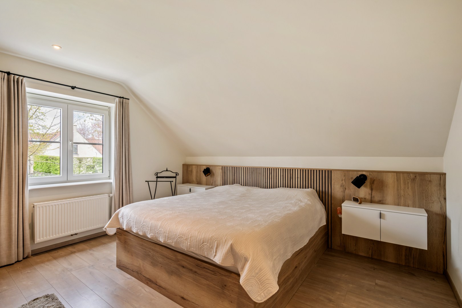 1eV: Op de eerste verdieping bevinden zich 3 ruime slaapkamers, waaronder een masterbedroom met op maat gemaakte kledingkast en een stijlvol houten hoofdbord. De ruime badkamer beschikt over een dubbele wastafel, inloopdouche én bad, verlicht door een dakvenster.